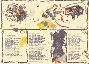 Sehr schön nuancierter Druck dieser Illustration zu einem Lyriktext von Dotremont. Mit einer handschriftlichen Widmung von Alechinsky an ein schwedisches Sammlerpaar.