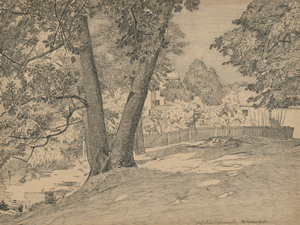 Feder über Spuren von Bleistift. 33,5 x 43,7 cm. Unten rechts bezeichnet, signiert und datiert "Jagdschloss Grunewald / Otto Altenkirch 1899", verso von Altenkirchs Ehefrau Anna Altenkirch bezeichnet "Herzlichste Weihnachtsgrüße / Euch beiden Lieben / von Eurer Anna Altenkirch / Siebenlehn, d. 24.12.[19]54".