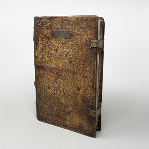 Breidenbach, Bernhard von. Peregrinatio in terram sanctam, deutsch. Die heyligen reyssen gen Jherusalem. 112 nn. Bl. Mit zahlreichen roten Lombarden und wenigen braunen Textunterstreichungen, großem koloriertem Titelholzschnitt und wdhl. koloriertem Textholzschnitt (Grabeskirche) sowie 6 kolorierten kleineren Textholzschnitten und 7 Holzschnitt-Tabellen, koloriertem ganzseitigen Holzschnitt. Ferner mit 7 teils doppelblattgroßen, teils gefalteten kolorierten Holzschnitt-Tafeln mit Ansichten und 14 (7 kolorierten) Textholzschnitten. Reich blindgeprägtes Schweinsleder d. Z. (Rücken erneuert, mehrere Wurmlöcher und Wurmgänge, kleine Fehlstellen, Schließen alt erneuert, Remboîtage unter Verwendung älteren Vorsatzpapiers) über leicht nach innen abgefasten schweren Holzdeckeln mit Streicheisenlinien und Präge- sowie Rollenstempeln mit Blüten und Rautenranken sowie einer Jagdrolle. Speyer, Peter Drach, zwischen 1502 und 1505.