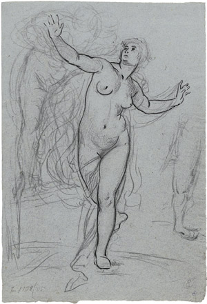 Weiblicher Akt, die Hände nach oben gestreckt.