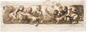 Mit einem Widder und einem Hund spielende Putten