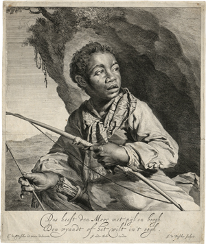 Der schwarze Bogenschütze. Radierung und Kupferstich nach Cornelis Visscher. 33,5 x 28 cm. Wessely (Jan de Visscher und Lambert Visscher) 27 II (von IV), Hollstein 148 III (von IV). Wz. undeutlich.