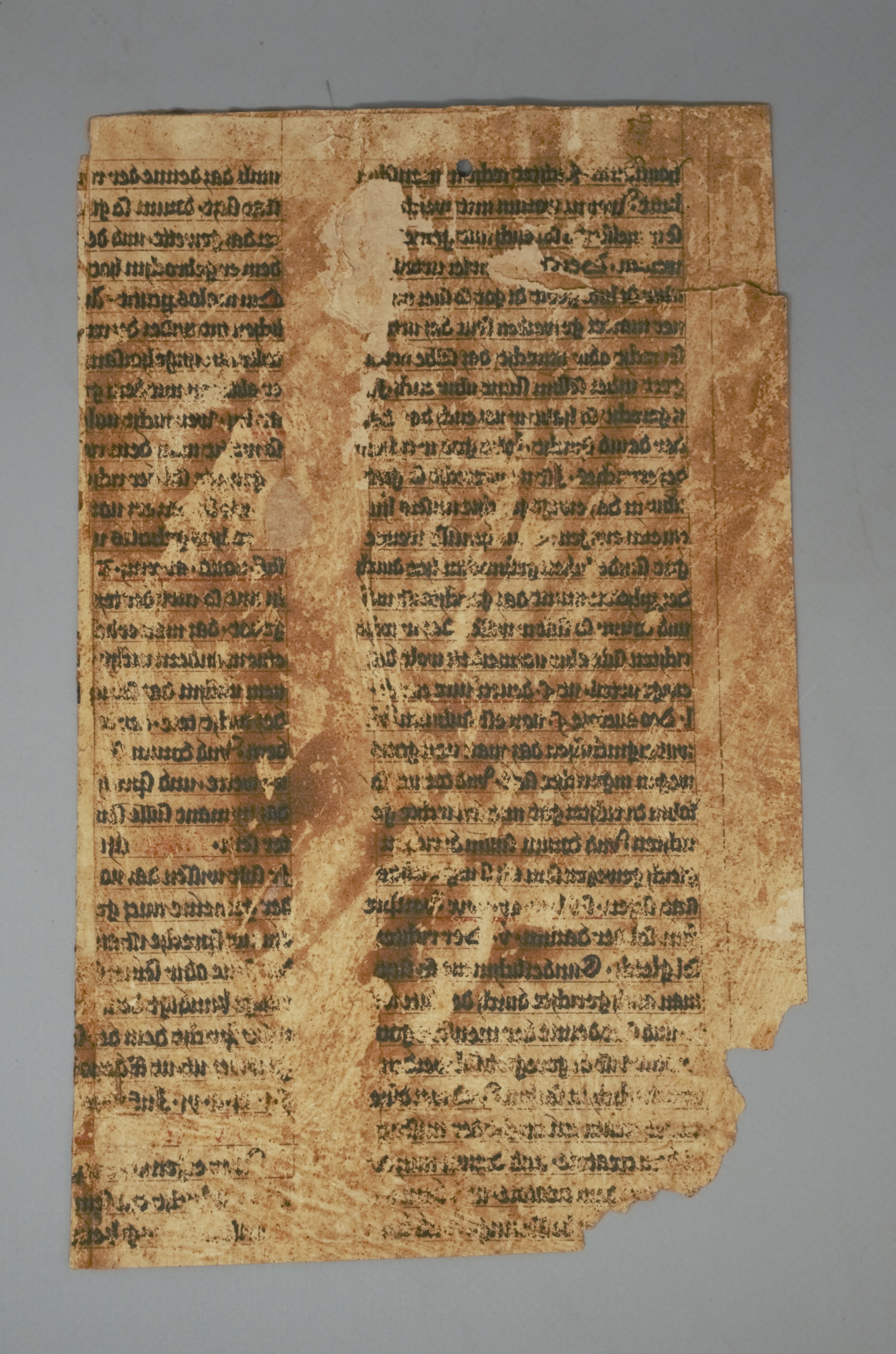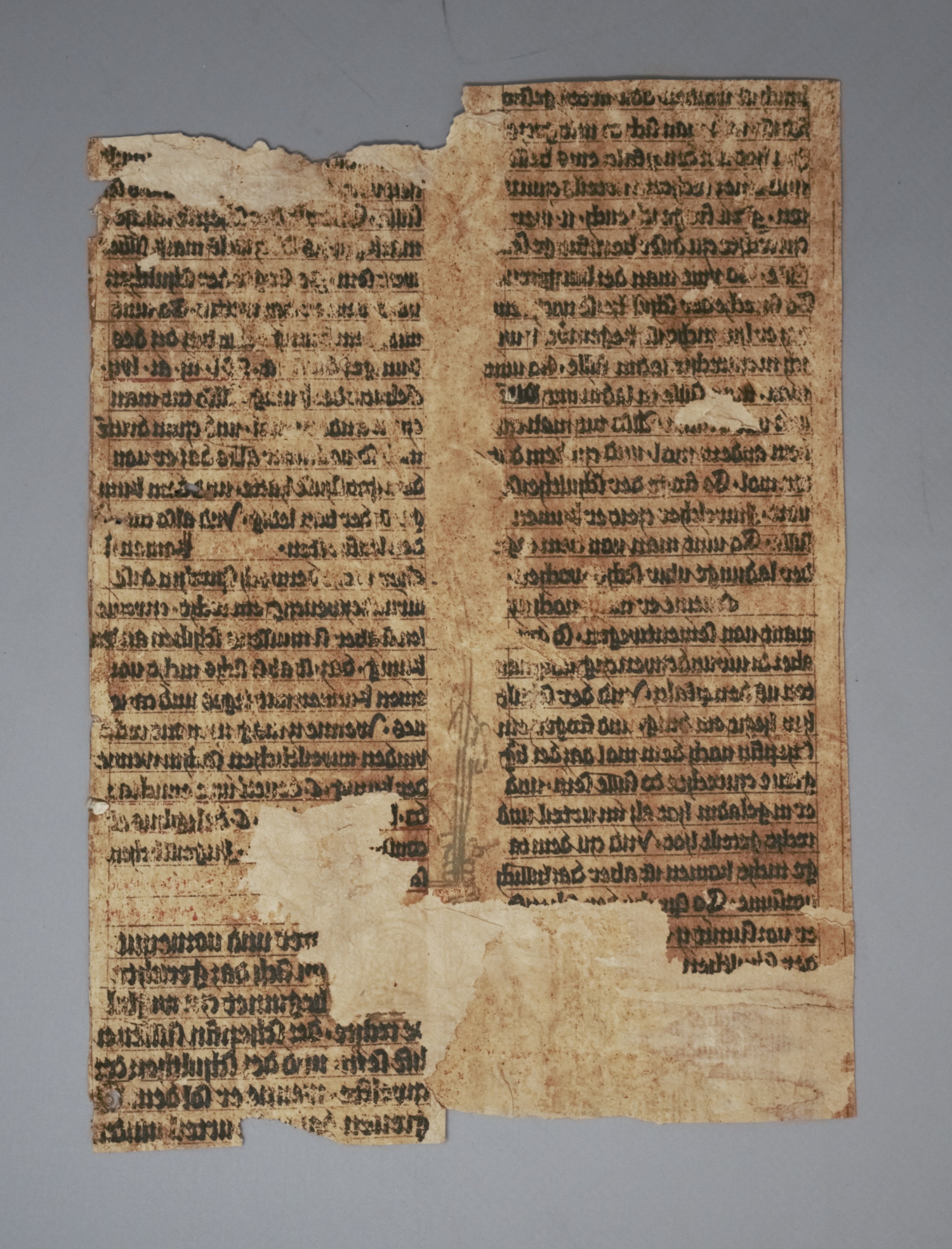 Magdeburger Stadtrecht. 2 Fragmente. Gotische Textura in Braunschwarz und Rot. 4 Kolumnen (fragmentarisch) mit bis zu 35 Zeilen. Kolumnengröße ca. 24 x 7,5 cm. Norddeutschland 14. Jahrhundert.