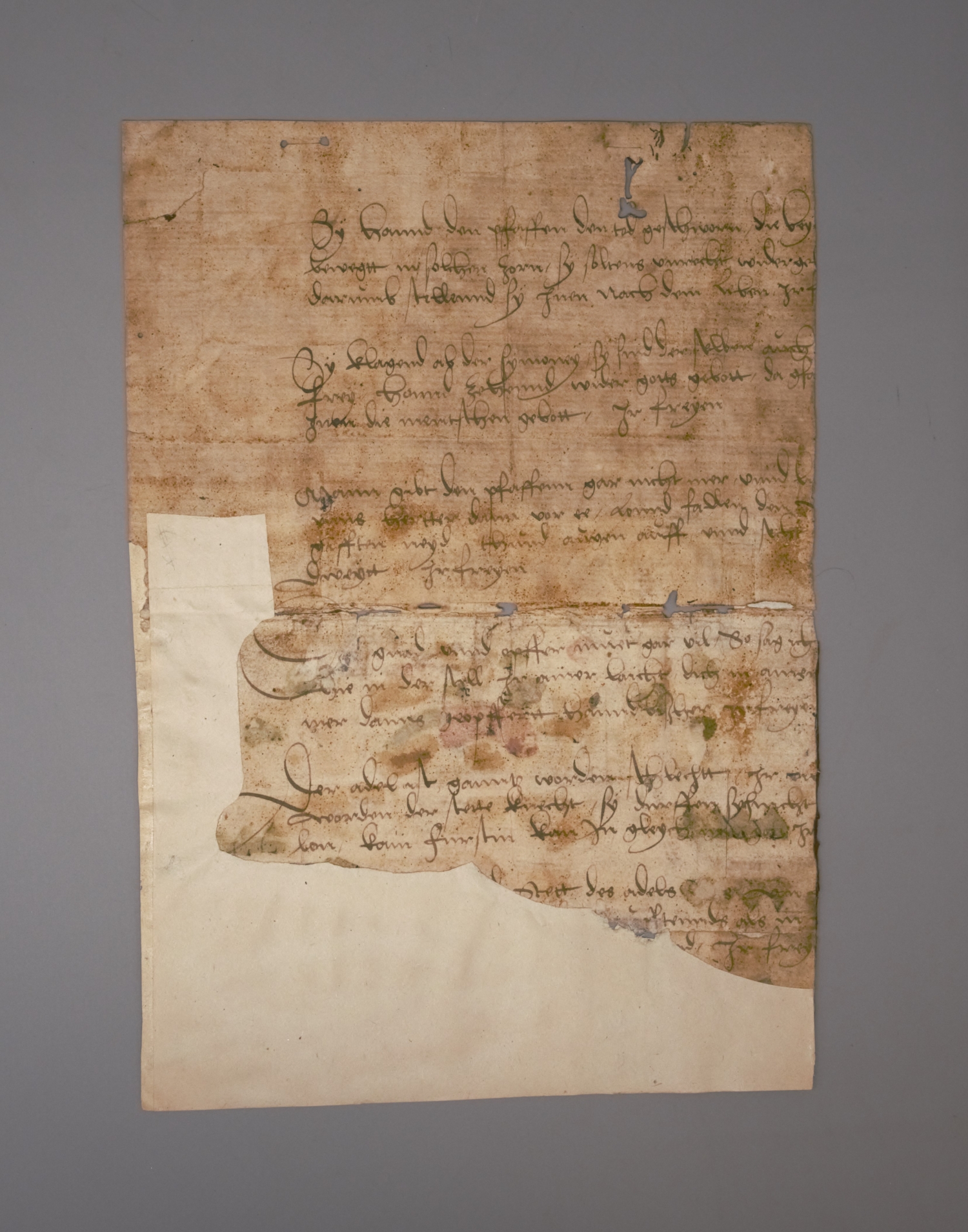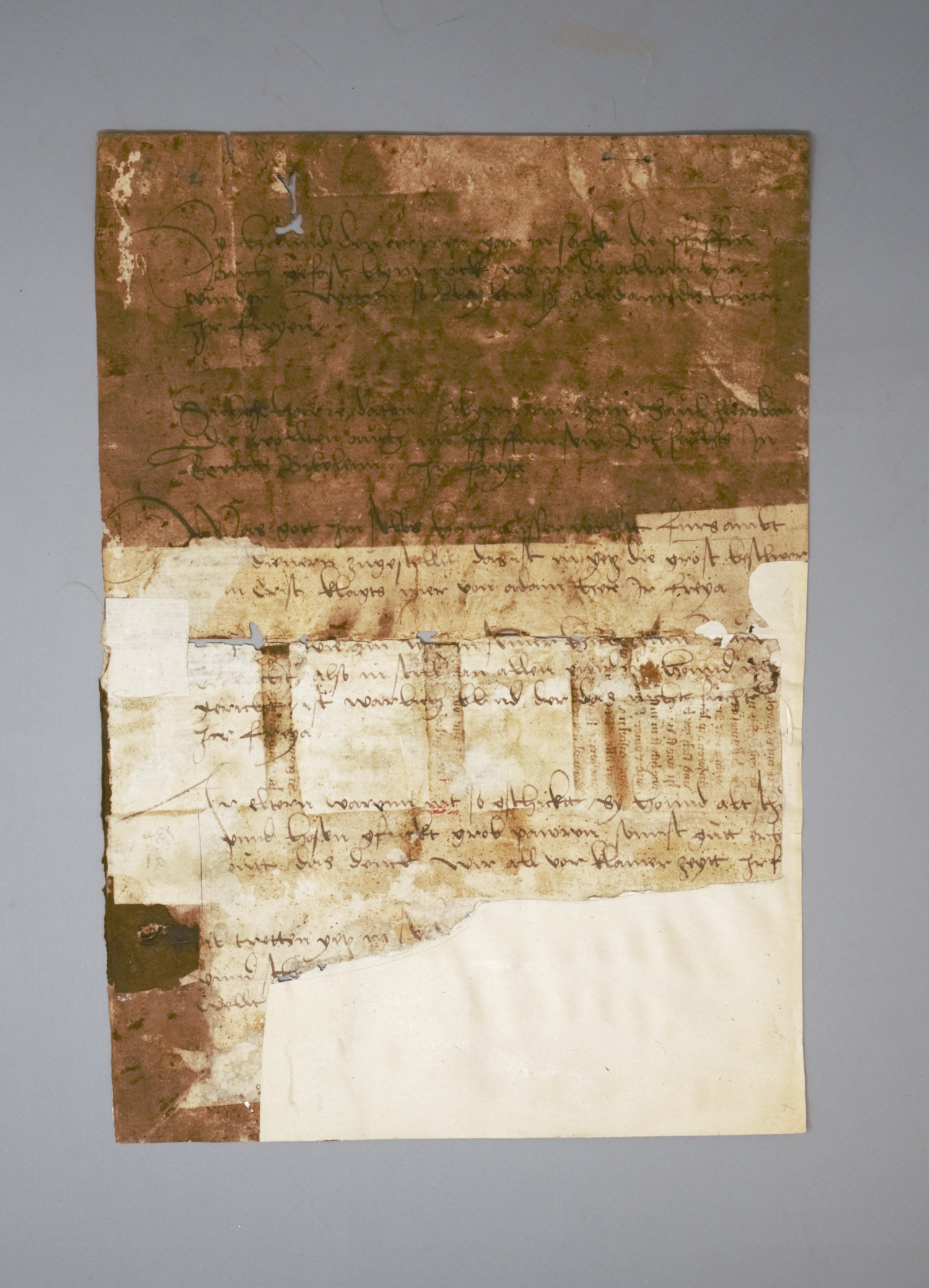 Zwei Fragmente einer hoch- bzw. frühspätmittelalterlichen Handschrift aus dem Magdeburger Stadtrecht mit Glossen, erhalten als spiegelverkehrter Abklatsch auf verleimtem Trägerpapier aus Karton. Vorhanden sind Fragmente von jeweils zwei Kolumnen in einer sauberen regelmäßigen Gotica textura. Identifiziert hat die Fragmente der Heidelberger Germanist und Mediävist Gerhard Eis (1908-1982). – Rote Tinte meist verblasst, bzw. unlesbar, da nicht auf das Trägerpapier mitübertragen, Aus- und Einbrüche, Textverluste - ein mittelalterliches Kuriosum. – Beiliegen: 2 weitere Blätter einer Handschrift aus der 2. Hälfte des 16. Jahrhunderts, möglicherweise aus der Handschrift, in deren Deckeln die beiden Spiegelfragmente stammen.
