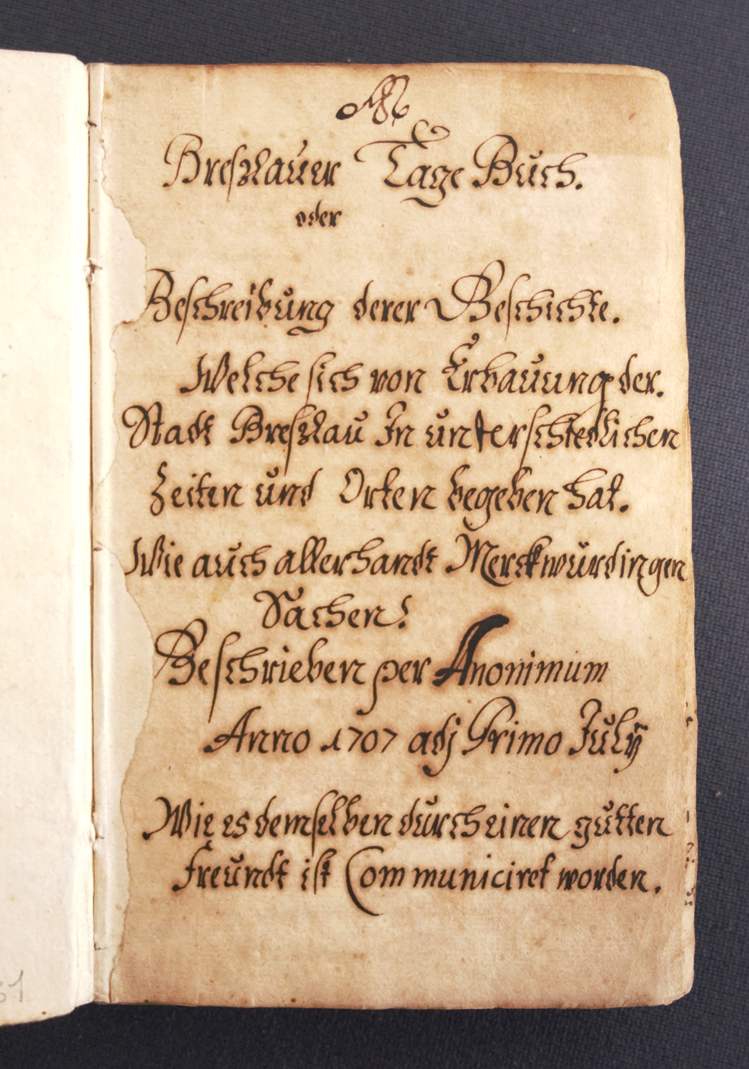 "Breßlauer Tage Buch oder Beschreibung derer Geschichte. Welche sich von Erbauung der Stadt Breßlau in unterschiedlichen Zeiten und Orten begeben hat. Wie auch allerhandt Merkwürdigen Sachen. Beschrieben per Anonimum Anno 1707 adj. Primo July Wie es demselben durch seinen gutten Freundt ist Communiciret worden." Deutsche Handschrift in schwarzbrauner Sepiatinte auf Papier. 159 Bl., davon 147 beschrieben. Schriftraum ca. 15 x 10. Format 17 x 10,5 cm. Etwas späterer marmorierter Pappband (berieben). Breslau 1707-1711.