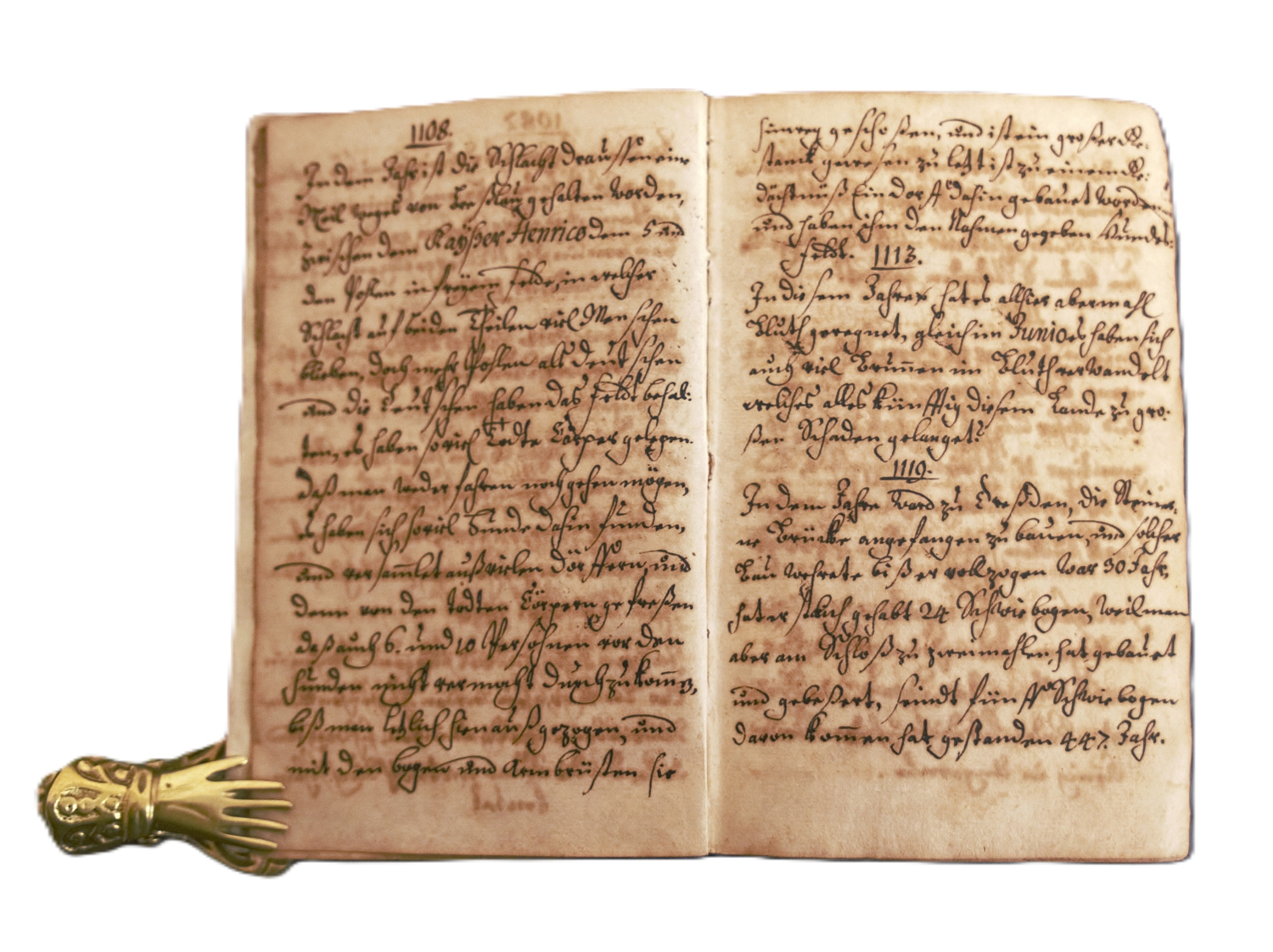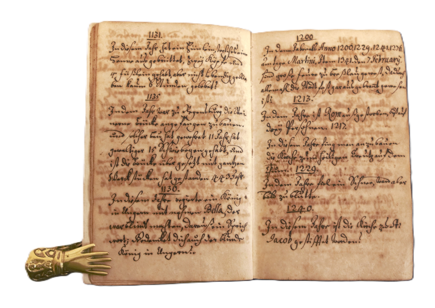 Anonym kompilierte und wohl im Druck nicht erschienene barocke Chronik Breslaus beginnend im Jahr der Stadtgründung 965 bis zum Jahr 1711, von verschiedenen Händen verfasst und teils ergänzt. Die Einträge erfolgen streng chronologisch für jedes Jahr und erfassen zumeist taggenau die historisch relevanten Ereignisse der Stadtgeschichte wie Schlachten, "Blutregen", Herrscher, Brückenbau, Errichtung und Zerstörung von Kirchen und Klöstern, Geburts- und Todesdaten, Kaiserbesuche, Städtegründungen, Hinrichtungen, Hungersnöte, Ernten, Epidemien, Anekdoten und weitere historische Ereignisse, die für die Stadt und teils auch für die Geschichte Europas relevant waren (z. B. Hinrichtung von Jan Hus, Fall Konstantinopels, Belagerung Magdeburgs etc.). Naturgemäß sind die Einträge bis zum 1500 zumeist spärlich und nehmen vom Umfang her dann zu, ab dem Jahr 1704 dann deutlich umfangreicher. Zwei Anhänge widmen sich ausführlich zwei historisch bedeutenden Ereignissen der Stadtgeschichte, der "Breßlauischen Bürgerrebellionen von 1333 bis 1418" (28 Seiten) und der "Breßlauische(n) Beschreibung von denen geworbenene Stadt-Soldaten Anno 1635 und 36" (38 Seiten). – Etwas gebräunt und vereinzelt mit geringem Tintenfraß, die Blätter dort leicht lädiert. Insgesamt jedoch durchweg lesbar.