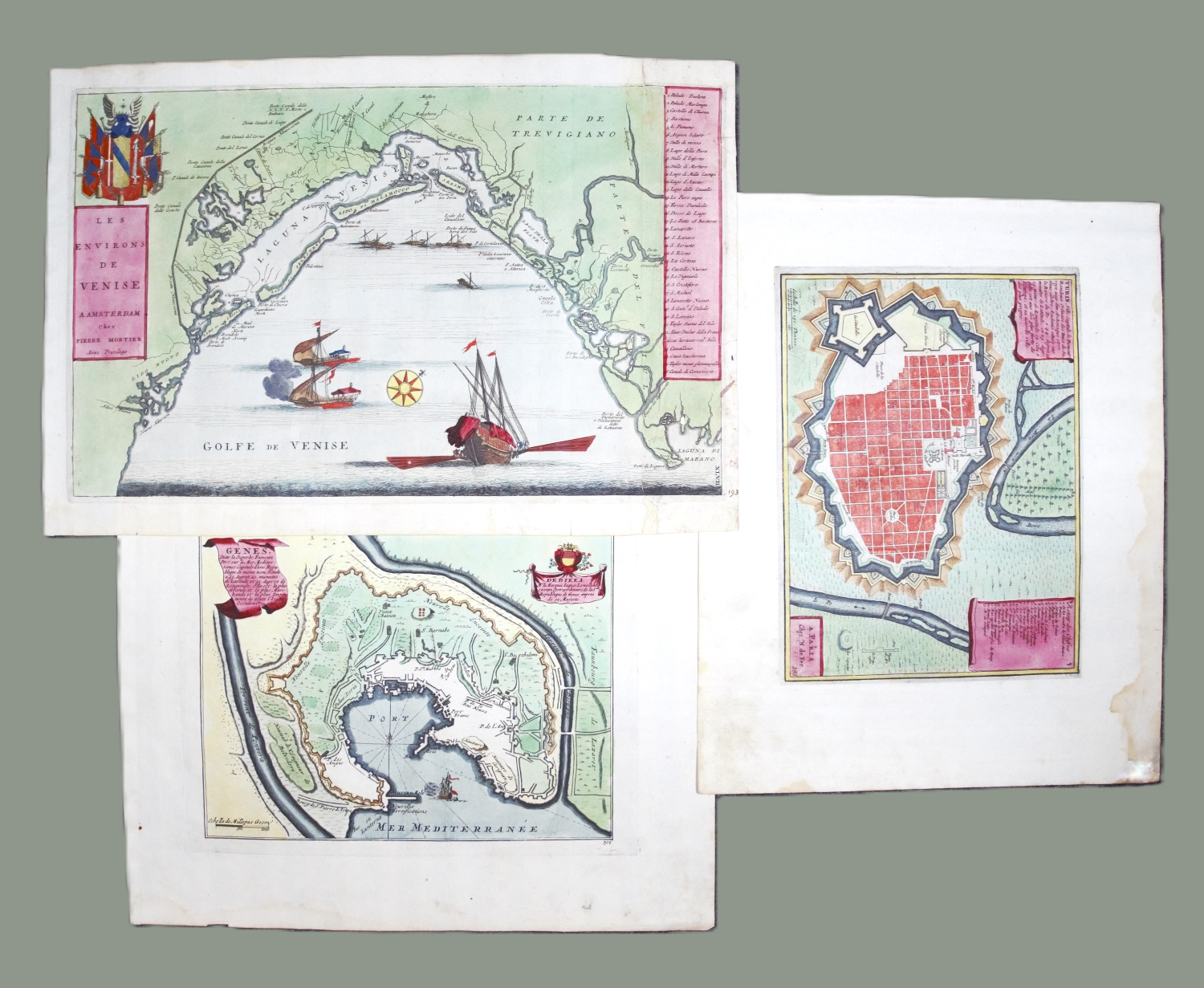 Vorhanden sind: I. Genes ditte la superbe fameux port sur la mer Mediterranée capitale d'une Republique de meme nom. Paris, N. de Fer, 1704. - II. Les environs de Venise. Amsterdam, Pierre Mortier, 1704. - III. Mantoüe ville considerable d'Italie capitale d'un Duché de même nom. Paris, N. de Fer, 1704. - IV. Turin. Ville Capitale de Piemont. Paris, N. de Fer, 1704. – Teils etwas braun- und feuchtfleckig, mit Knickspuren und wenigen hinterlegten Einrissen oder Fehlstellen. Die Stiche sind alle sehr hübsch und kräftig koloriert.