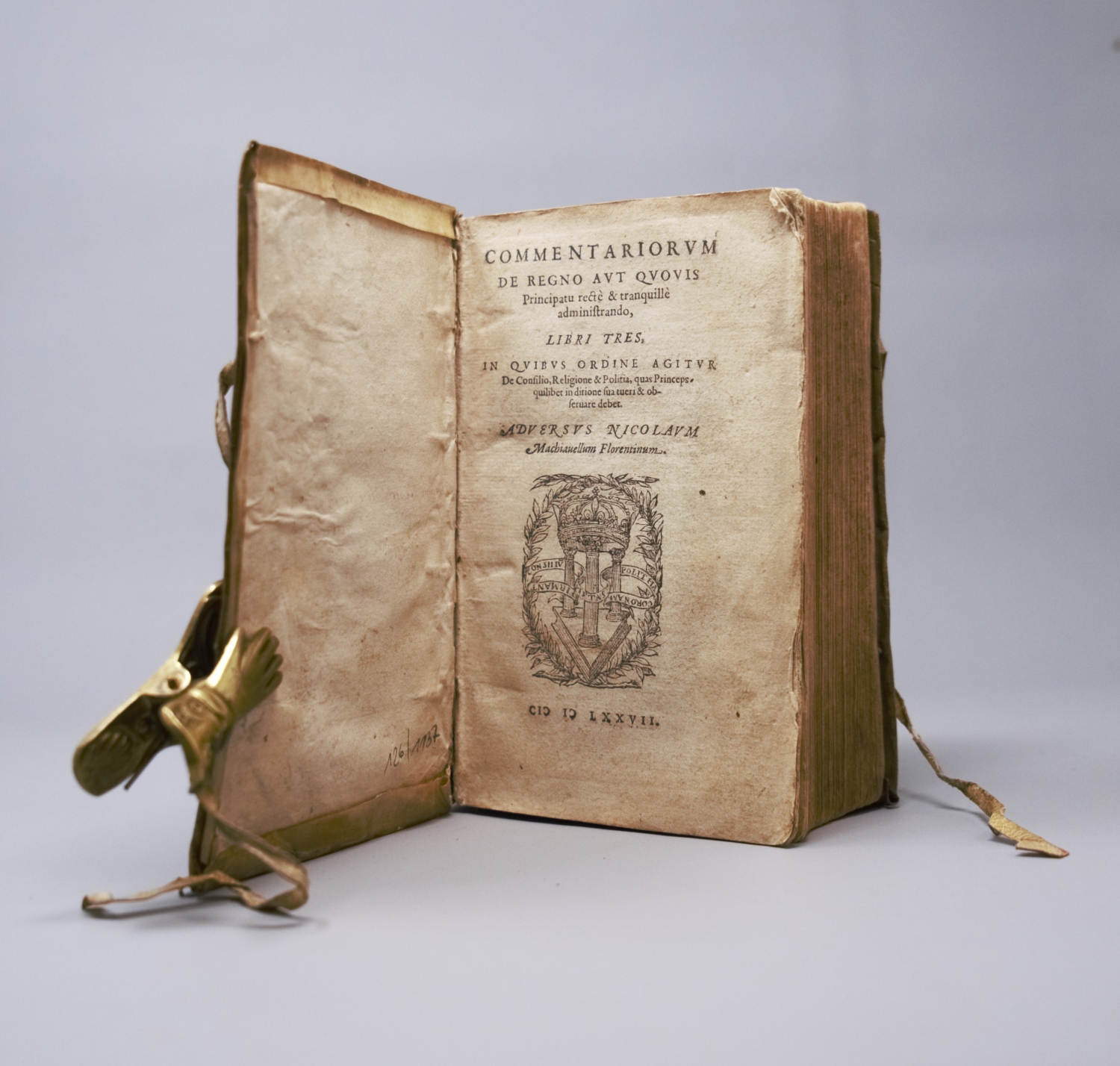 (Gentillet, Innocent). Commentariorum de regno aut quovis principatu rectè & tranquillè administrando, libri tres. Adversus Nicolaum Machiavellum Florentinum. 6 Bl., 20, 708 S., 6 Bl. Mit Holzschnitt-Druckermarke. 17 x 11 cm. Flexibles Pergament d. Z. (etwas fleckig und berieben) mit 4 Schließbändern. (Wohl Genf, Jacob Stoer), 1577.