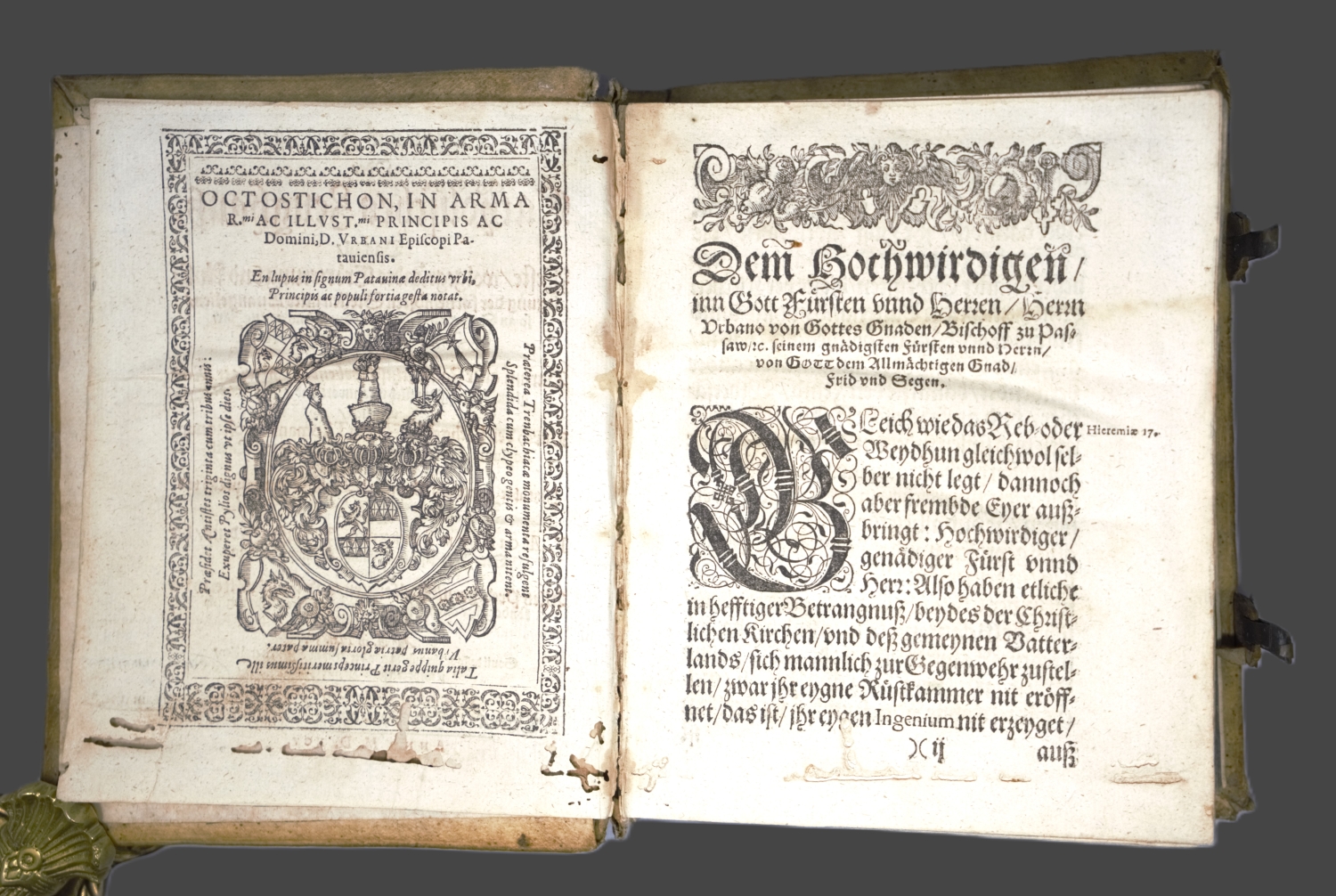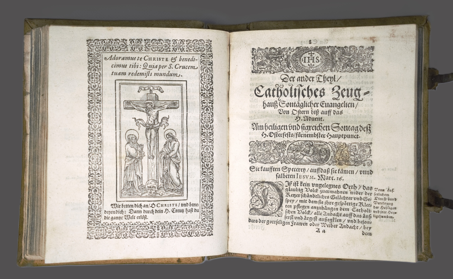 Stapleton, Thomas. Kirchen- und Hauspostill oder Catholisches Zeughauss, das ist feste wolgegründte Erörterung und Ausslegung der fürnembsten Stellen aller Evangelien. 26 Bl., 239 S., 341 S., 4 Bl. Mit Holzschnittwappen im Text und mit großer Holzschnittdruckermarke am Schluss. Titel in Schwarz und Rot. 20 x 15,5 cm. Schweinsleder d. Z. (stark berieben, bestoßen und gebräunt) über Holzdeckel mit zwei Messingschließen. Ingolstatt, Wolffgang Eder, 1695.