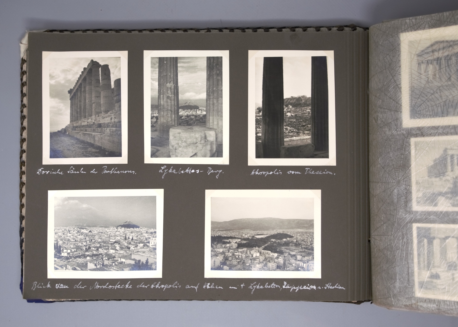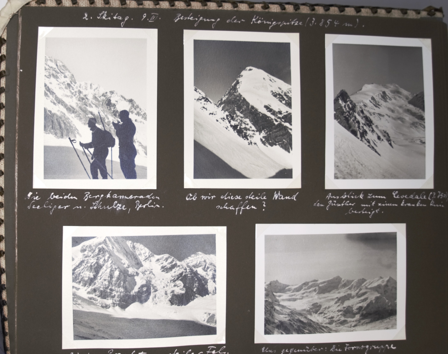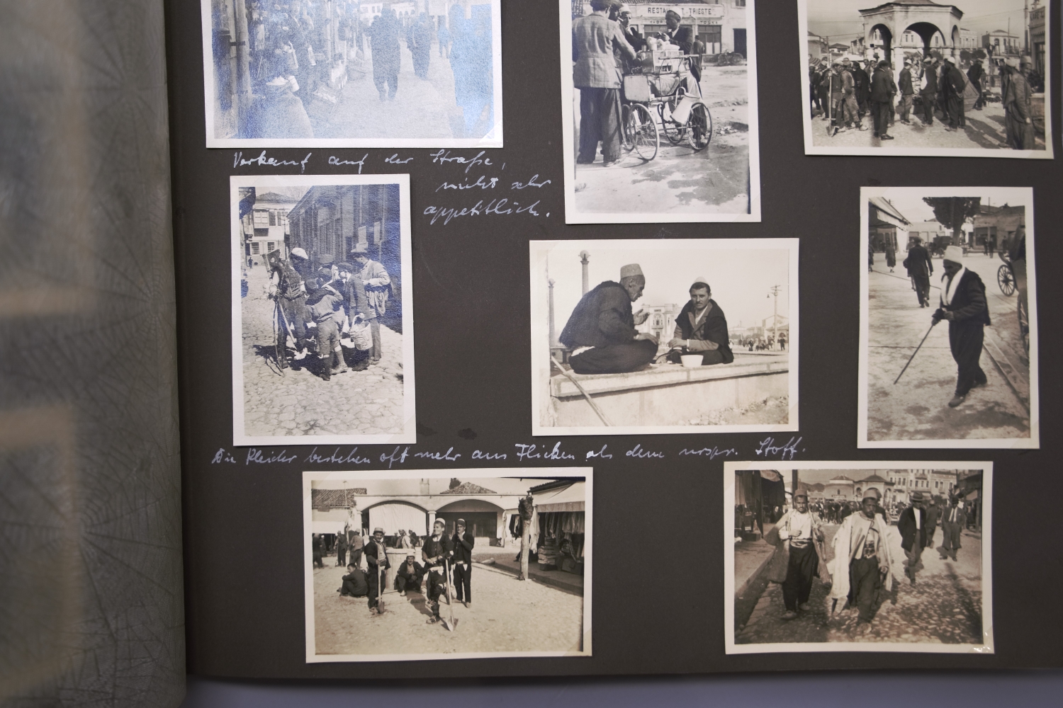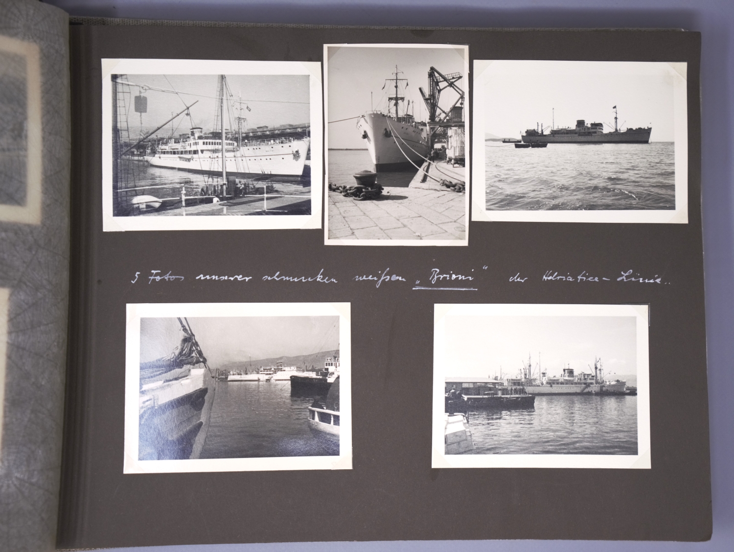 Privates Fotoalbum mit annährend 300 Fotos. Sie schildern eine Reise von vier befreundeten jungen Männern, die vom 4. März bis 1. April 1938 andauerte. Die Vier bereisten die Alpen, wanderten und trieben Wintersport im Ortlergebiet in Südtirol, besuchten Meran und bestiegen in Venedig das Schiff Brioni, das sie nach Triest, Koper, Split und Tirana bis Korfu brachte, unterbrochen von Landausflügen, etwa zu den Adelsberger Grotten. Höhepunkt der Reise war der Besuch von Athen. Weiter ging es nach Smyrna, Patmos, Rhodos, zurück nach Venedig und mit der Bahn über Bozen in "die Heimat - Großdeutschland - [wo es] doch am schönsten [ist] München, Haus der Kunst" (so der Eintrag unter dem letzten Foto). Alle Fotos sind erläutert, genannt sind die Orte, vereinzelt auch die Reiseumstände, Tageszeiten etc. sowie die Namen der gezeigten vier Freunde: Günther Dünweg aus Neumagen, Richard Dahmen aus Mülheim ("Capitano"), Leo Wald, Trier ("Musikwart") und Rolf Harder, Trier ("teilt sich mit Günther in Finanzsachen"). Die Kommentare sind glücklicherweise nicht im aufdringlich spaßigen Stil gehalten, wie es bei Alben dieser Art oft der Fall ist. Einige Fotos zeigen Günthers fotografisches Talent, dem es immer wieder gelingt, nicht nur Schnappschüsse, sondern atmosphärisch dichte Aufnahmen zu produzieren. Die Fotos zeigen das, was man in einem Album dieser Art erwartet: Straßenszenen, Gebäude, Landschaftsaufnahmen, Land und Leute, das Leben an Bord, die antiken Monumente etc. Einige Kommentare sind im Herrenmenschen-Ton gehalten, z. B. "Hauptbeschäftigung der Männer in Tirana: Im Straßendreck herumlungern." Allein über einen einzigen Teilnehmer der Reise, über Günther Dünweg, kann man auf der Website der Gesellschaft für Geschichte des Weines (https://www.geschichte-des-weines.de) Folgendes erfahren: "Weingutsbesitzer und Weinkommissionär. *6. Mai 1912 in Neumagen, † 9. April 1989 ebd. - Entstammt einer alteingesessenen Weingutsfamilie. Weinbaustudium in Geisenheim. Danach Übernahme des elterlichen Weingutes, Weinhandels- und Weinkommissions-Unternehmens. Gründungsmitglied der Weinbruderschaft Mosel-Saar-Ruwer und von 1970−88 deren Bruderschaftsmeister, danach bis zu seinem Tode Ehrenbruderschaftsmeister. 38 Jahre Mitglied des Kreistages Bernkastel und Bernkastel-Wittlich und fast ebensolange Mitglied des Kreisausschusses und des Weinbauausschusses. 1946−84 führte er die Kreistagsfraktion der FDP. Im Heimatort Neumagen war er 1947−80 Vorsitzender des Sportvereins. 1986 Ernennung zum Ökonomierat und Auszeichnung mit dem Bundesverdienstkreuz, der Freiherr-vom-Stein-Plakette und der Theodor-Heuss-Medaille. Er hat sich um den Weinbau von Mosel-Saar-Ruwer sehr verdient gemacht, wobei er besonders die weinrechtlichen Entwicklungen mitgestaltet hat. Dabei ist er für die Rebsorte Riesling und ihre weinrechtliche Stellung, Bezeichnung und Spezialität in besonderem Maße eingetreten. Aber auch der Erhalt und die Förderung der Familienbetriebe im Weinbaugebiet und damit die Zukunft der Weinlandschaft waren ihm ein großes Anliegen." Das Album bekommt auch durch die Tatsache, dass eineinhalb Jahre später wohl alle vier Reiseburschen in welcher Funktion auch immer in Hitlers Malstrom des Todes gerieten, eine besondere Wirkung. - Die beiden gekreuzt montierten Stoffbänder auf dem Vorderdeckel tragen die Aufschriften "Marco Polo" und "Filippo Rimani". – Sehr gut erhalten.