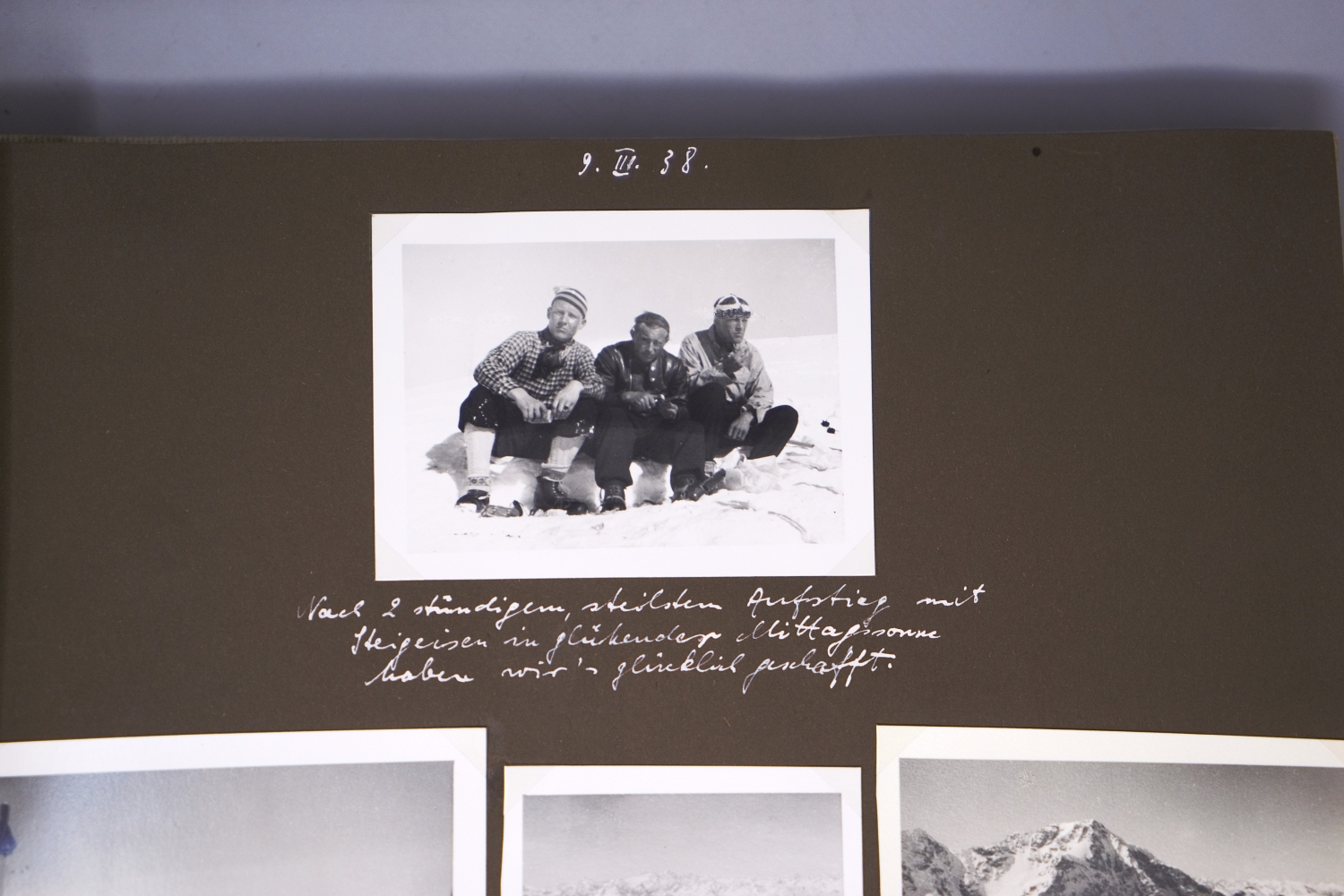 Privates Fotoalbum. Ca. 290 Silbergelatineabzüge (meist im Format 6 x 9 cm bis 8 x 10,5 cm). Lose montiert auf dunkelbraune Unterssatzkartons. 25,5 x 33 cm. Leinen d. Z. (etwas fleckig), Vorderdeckel mit Ledersaumnaht und zwei gekreuzten Stoffbändern (weiß und blau), Heftung mit Lederbändchen und Dornschließe. Deutschland 1938.