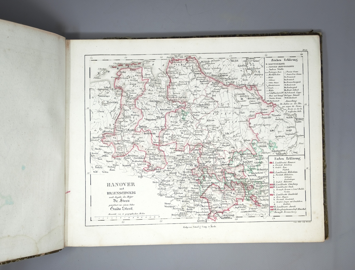 Streit, F. W. Atlas von Europa. 1 Bl. (Verzeichnis). Mit gestochenem Titel und 82 (78 grenzkoloriert) gestochenen Karten. 26 x 32,5 cm. Halbleder d. Z. (berieben und bestoßen, Bezugspapier mit teils größeren Schabspuren). Berlin, W. Natorff, 1837.