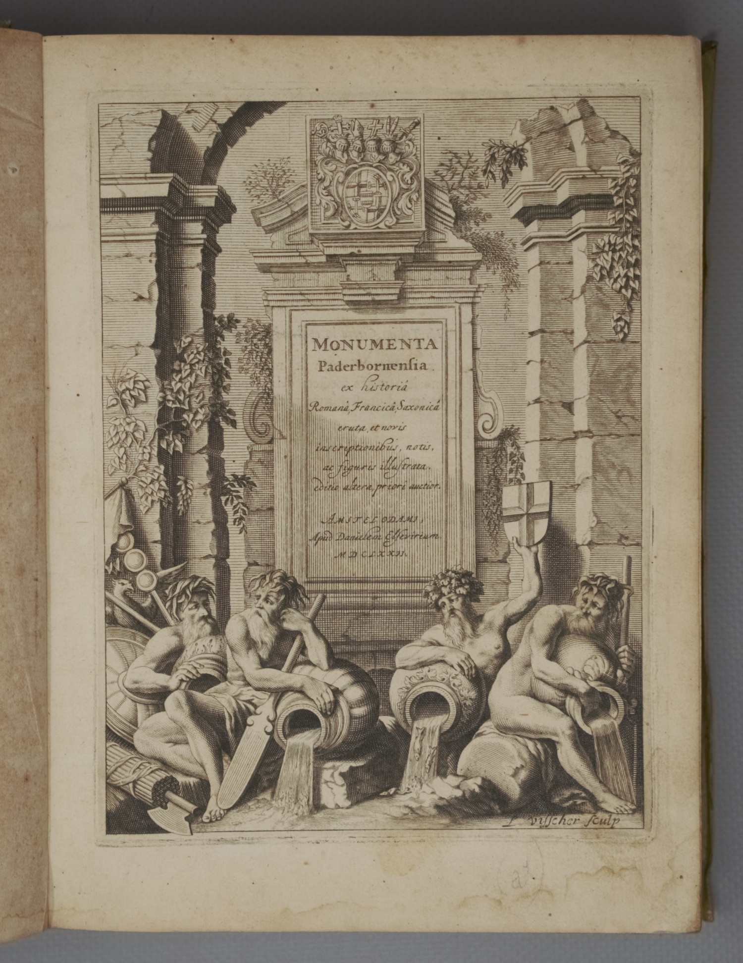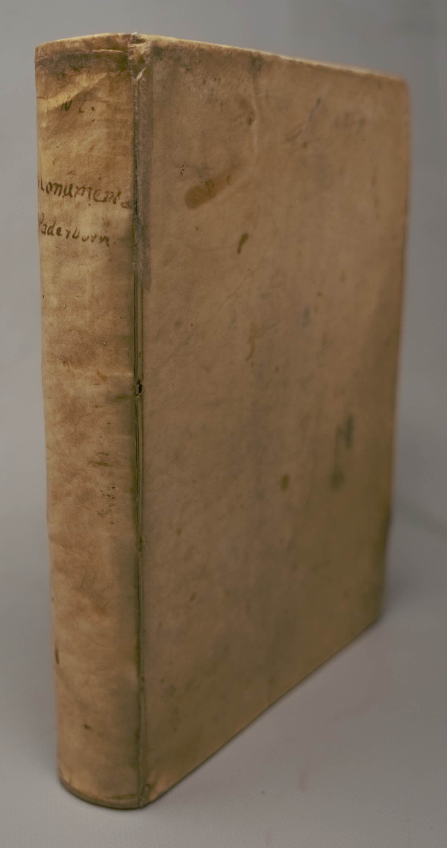(Fürstenberg, Ferdinand von). Monumenta Paderbornensia ex historia Romana, Francica, Saxonica eruta, et novis inscriptionibus, figuris, tabulis geographicis et notis illustrata. Editio altera priori auctior. 2 Teile in 1 Band. 26 Bl., 337 S., 9 Bl.; 7 Bl., 134 S., 3 Bl. Mit 2 Kupfertiteln, 2 gestochenen Portraits, 2 doppelblattgroßen Kupfertafeln, 3 doppelblattgroßen Kupferstichkarten und 27 blattgroßen Textkupfern. 21,5 x 16 cm. Pergament d. Z. (fleckig und berieben) mit hs. RTitel. Amsterdam, Daniel Elzevier, 1672.