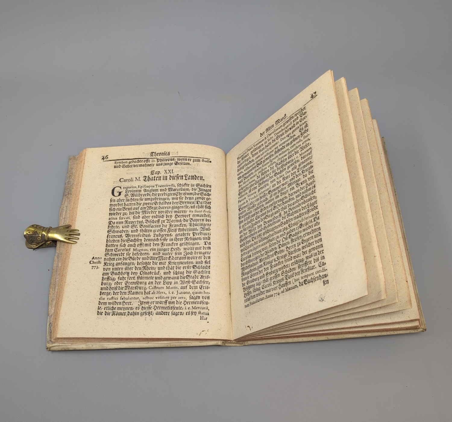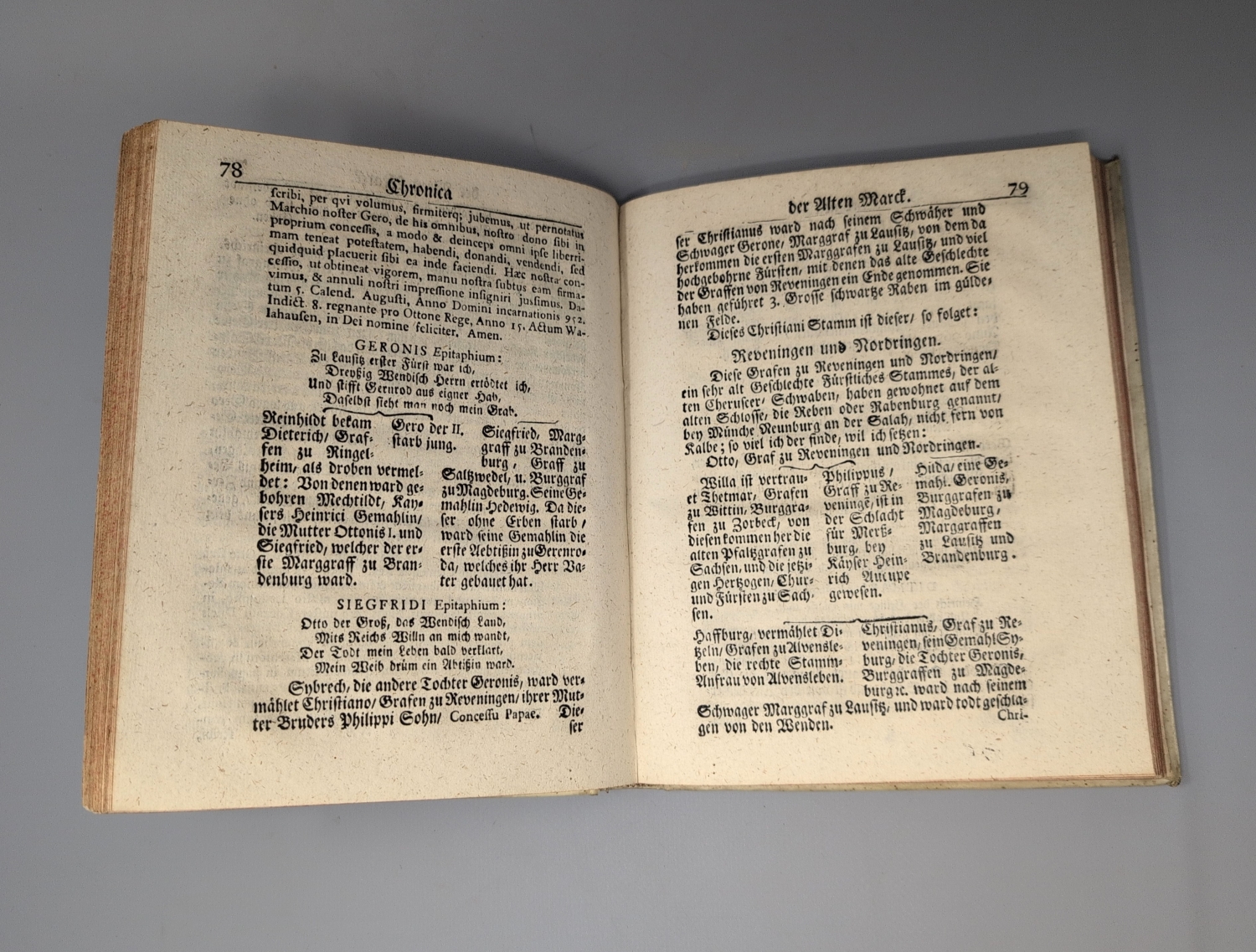 VD18 14448882. – Dritte Ausgabe dieser frühen, zuerst 1579 erschienenen Regionalgeschichte der Altmark durch den Historiker und evangelischen Theologen Christoph Entzelt (1517-1583), die sich allerdings vornehmlich auf genealogische und heraldische Details konzentriert. "Neben seiner treu verwalteten Seelsorge beschäftigte er sich mit der Geschichte der Altmark Brandenburg. Als Resultat dieser Studien veröffentlichte er 1579 zu Magdeburg seine von Regenten-Genealogien durchwebte 'Cronica der alten Mark', die später der Feldprediger Chr. W. Bayer mit Anmerkungen bereicherte und 1732 zu Salzwedel von neuem herausgab". Im Anhang die mit eigenem Titel ausgestattete "Geschichte der Marggraffschafft Saltzwedel" von Caspar Sagittarius (1643-1694). – Titel im Seitenrand gebräunt und etwas lädiert, dort hinterlegt, Innenspiegel mit mehreren Besitzeinträgen.