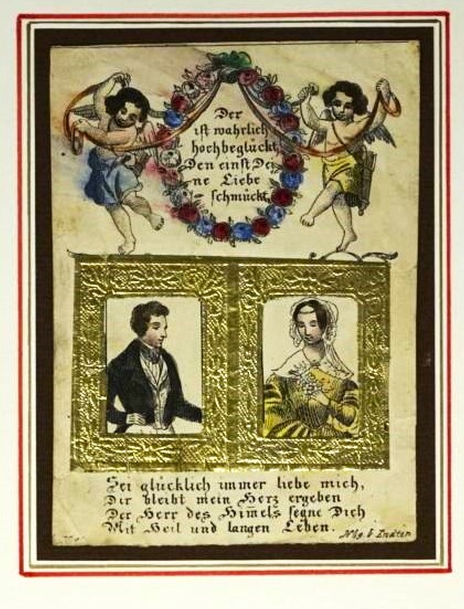 Sammlung von Billets, Kupferstichen und Zeichnungen des 18.-19. Jahrhunderts. Ca. 160 kolorierte oder farbige Billets in Kupferstich, Radierung und Chromolithographie, 25 Zeichnungen (22 in Gouache), 16 (teils kolorierten) Kupferstichen und 15 Umschlägen. Auf Papier, Glanzpapier, Seide, Gaze, Samt und Pergament gedruckt, viele mit Blindprägung, Spitze, Gold- oder Silberrahmen. Teils auf Papier montiert. Ca. 6 x 8 bis 18 x 11,5 cm. Deutschland 18.-19. Jahrhundert.