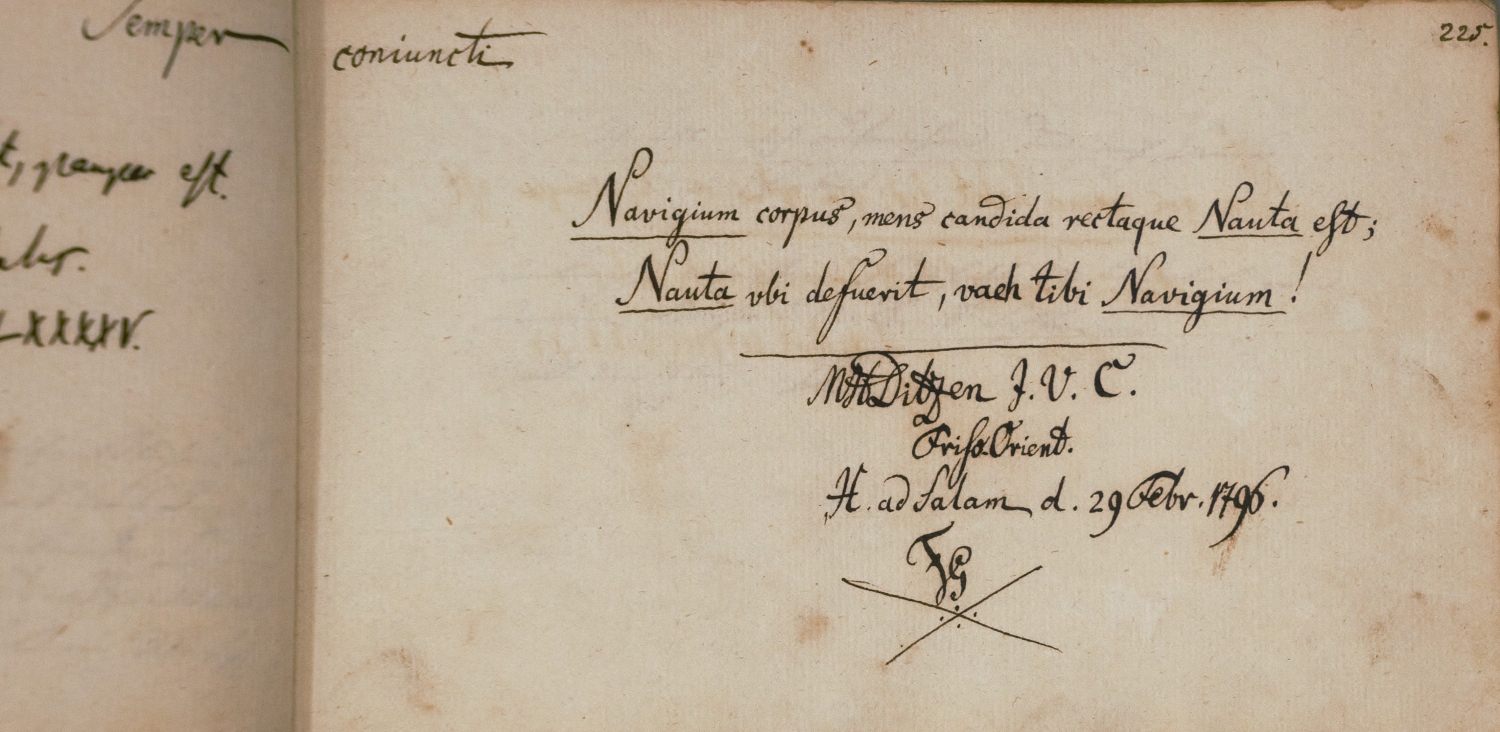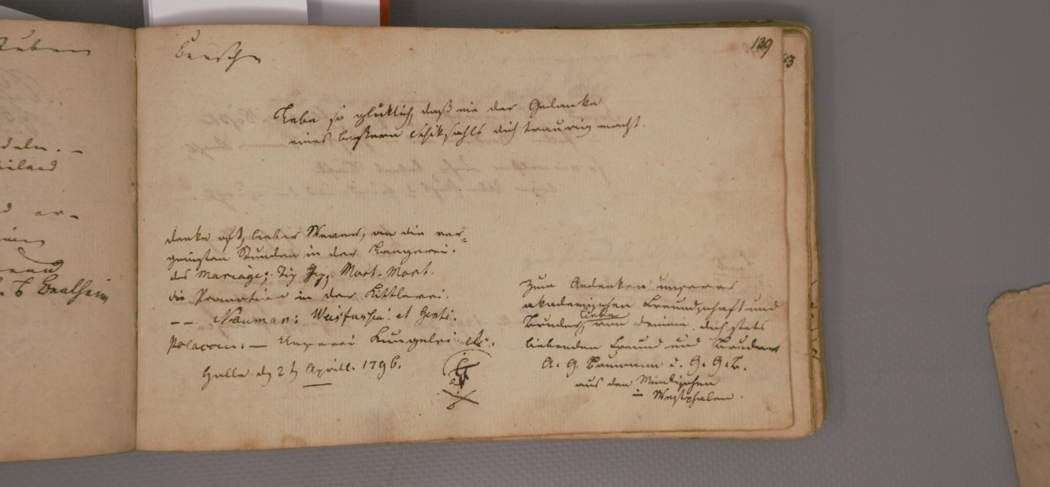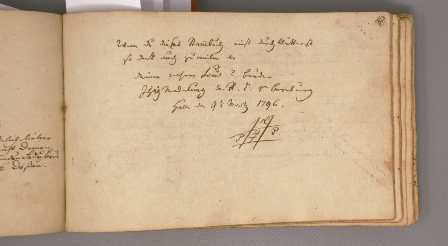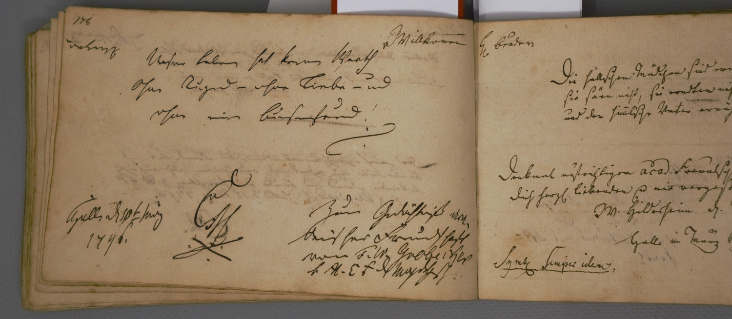 Mit 242 beschriebenen Seiten sehr reich gefülltes Stammbuch, dessen Beiträge nur aus 2 Städten stammen: der weitaus größte Teil (mehr als 200 in den Jahren 1795-1796) von Kommilitonen Wevers in Halle und ein kleiner Teil 1814-1837 in Norddinker, heute einem Stadtteil von Hamm. Die Studenten zitieren Shakespeare, Pope, Klopstock, Hagedorn, Haller, Kotzebue und 1795 auch Goethe. Fast alle Eintragungen in Halle sind mit burschenschaftlichen Zeichen versehen. - Einband und mindestens die 2 ersten Blätter fehlen; anfangs fleckig; Gebrauchsspuren.