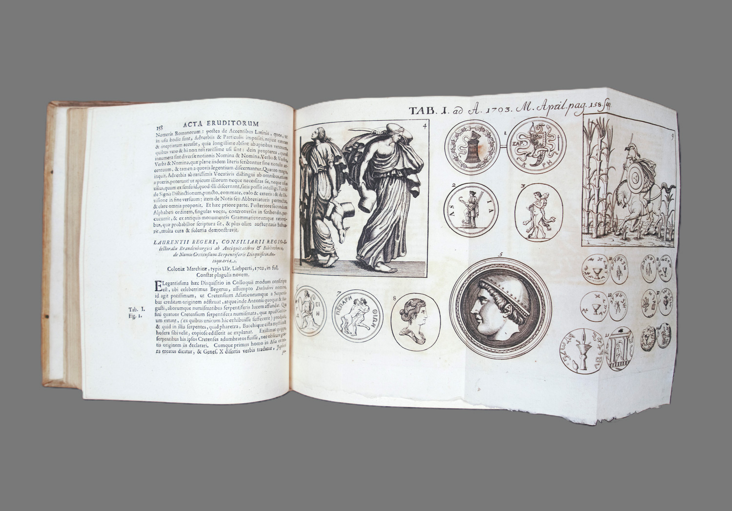 Acta eruditorum. Jahrgang 1703 und 1704. 2 Teile in 1 Band. 1 Bl., 582 S.; 1 Bl., 592 S. Mit 12 gefalteten Kupfertafeln. 21 x 16,5 cm. Blindgeprägtes Schweinsleder d. Z. (berieben, bestoßen und fleckig) über Holzdeckel mit goldgeprägtem Monogramm auf dem VDeckel "F" sowie 2 Messingschließen. Leipzig, Christian Goez, 1703-1704.
