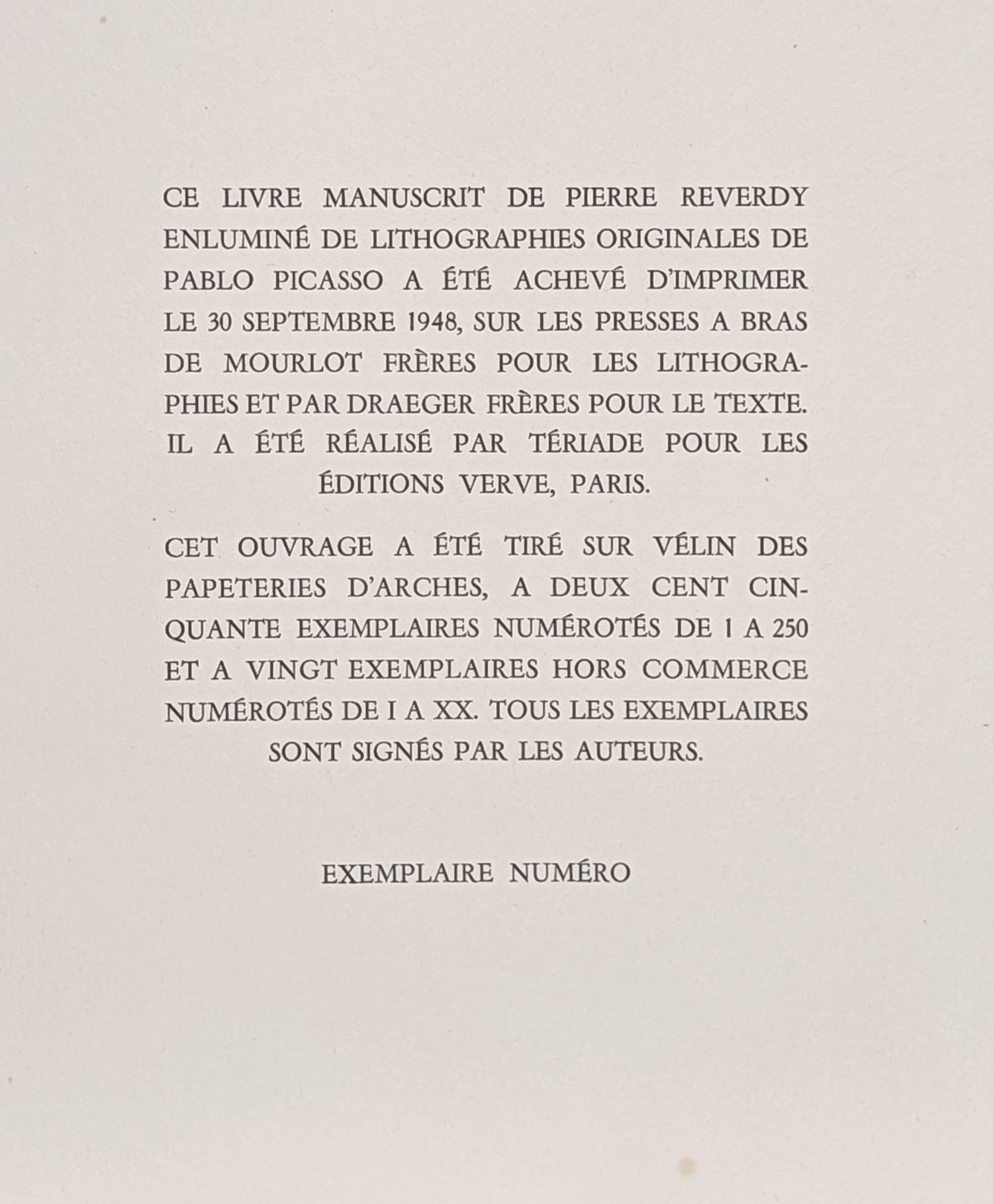 Monod 9676. Mourlot 117. Rauch 70. Kat. Klipstein & Kornfeld, Tériade Editeur 37. – Nicht nummeriertes Exemplar (250 Ex.; Gesamtauflage: 270 Ex.) auf Arches Vélin, ohne Signaturen im Druckvermerk. Die in Rot gedruckten Orig.- Lithograhien ornamentieren die lithographierte Handschrift des Dichters. Der Text wurde bei Draeger Fréres nach der Handschrift Reverdys lithographiert gedruckt. - Eine der außerwöhnlichsten Illustrationsfolgen Picassos, in ihrer strikten Reduzierung auf Schwarz und Rot von großer Intensität. – Unbeschnittene, gefalzte Bögen. Vereinzelt leichter Abklatsch der Lithographien, stellenweise leicht stockfleckig. Etwas gebräunt, insgesamt gutes Exemplar.