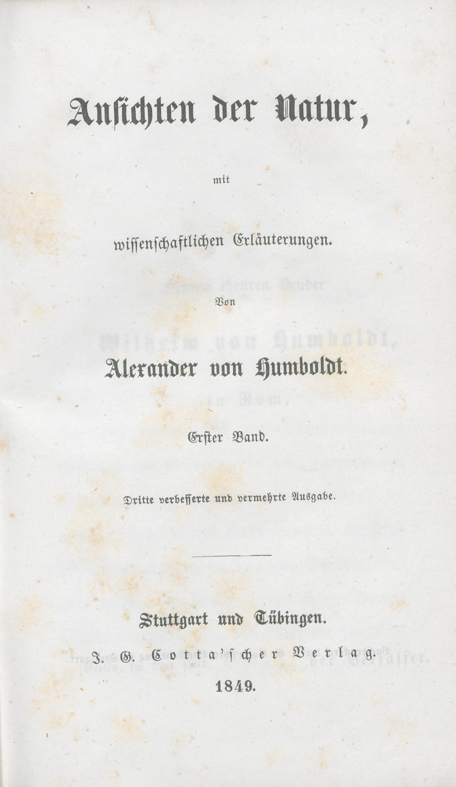 Goedeke VI, 261, 10. Löwenberg 181. Griep-Luber I, 0644. Sabin 33703. Poggendorff I, 1158. Vgl. Fischer, Cotta 648 und 1618. – Maßgebliche dritte Auflage, in der Humboldt noch in hohem Alter Ergebnisse seiner Reisen wesentlich veränderte und um die Erkenntnisse einer 1829 ins nördliche Asien unternommenen Expedition erweiterte. Bd. I. Ueber die Steppen und Wüste, Bd. II. Ideen zu einer Physiognomik der Gewächse. "Humboldt nennt seine 'Ansichten' sein Lieblingswerk, 'ein rein auf deutsche Gefühlsweise berechnetes Buch'." "Diese Sammlung ist der Ertrag einer fast sechsjährigen Forschungsreise, die Humboldt über Teneriffa nach Venezuela, Kolumbien, Ekuador, Mexiko und in die USA führte: eine der umfassendsten und bedeutendsten Forschungsreisen der Geschichte, die das Natur- und Erdbild - und in weiterem Umfang auch die Kultur Mittel- und Südamerikas erschloß" (KLL 1063). – Etwas stockfleckig, Titel mit zwei Besitzeinträgen, fl. Vorsatz mit weiterem altem Besitzeintrag sowie modernem Kugelschreibernotat.
