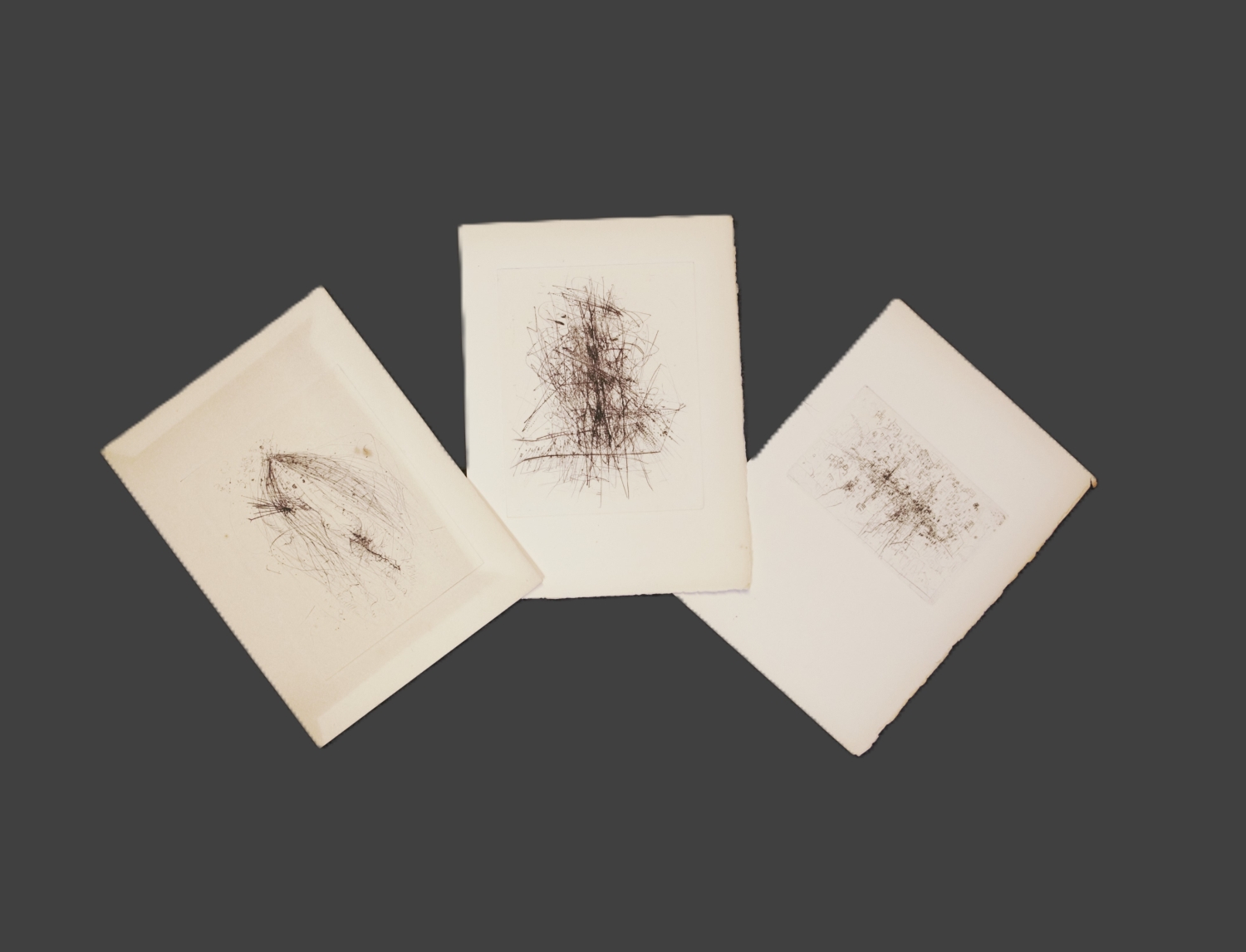 Grohmann, Bücher 8. – Eines der 424 arab. numer. Exemplare (Gesamtaufl. 450 Ex.). Die 3 Kaltnadelarbeiten lose beiliegend. Erste Ausgabe des 1935 in Neapel geschriebenen Textes "Nourritures", gefolgt von Auszügen aus "La Nausée". – Eine Radierung durch Abklatsch des Vorderumschlags gebräunt.