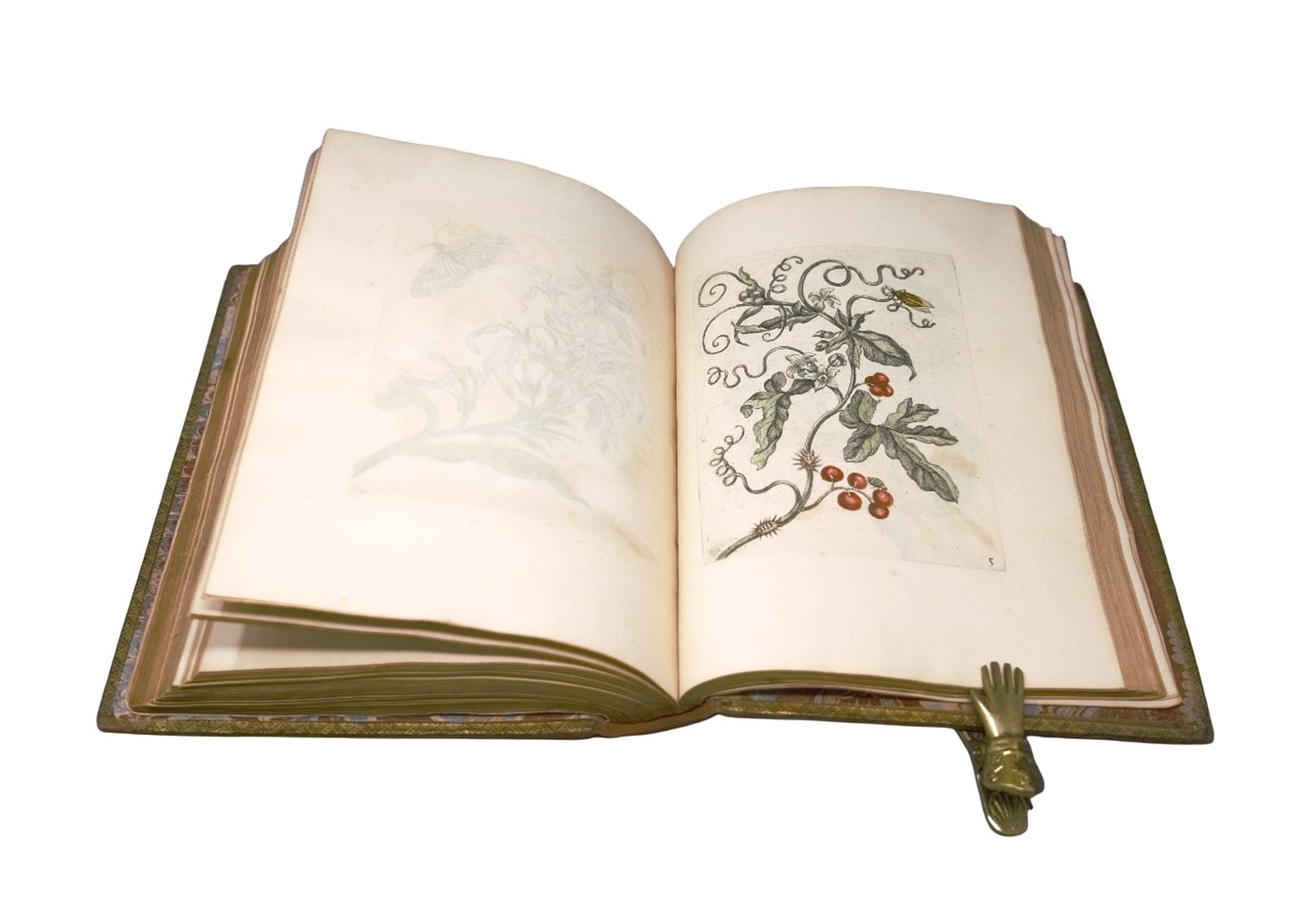 Merian, Maria Sibylla. Erucarum ortus, alimentum et paradoxa metamorphosis, In qua Origo, pabulum, transformatio, nec non tempus, locus, &c proprietates crucarum, vermium, papilionum, phalaenarum, muscarum, aliorumque hujusmodi exsanguium animalculorum exhibentur, in Favorem, atque insectorum, herbarum, florum, & plantarum Amatorum, tum etiam pictorum, limbolarium, aliorumque commodum exacte inquista, ad vivum delineata, typis excusa, compendiosemque descripta. 4 Bl., 64 S. Mit koloriertem Portrait-Kupfer von Houbraken, illustr. Kupfertitel zur Abteilung I und 150 kolorierten Kupfertafeln (numeriert von 1-50, I-L, 1-50) von Maria Sibylla Merian. 24, 5 x 19, 5 cm. Marmorierter, geglätteter Kalblederband d. Z. auf 5 Bünden, mit Rückenschild, vergold. Rückentitel, zweifacher vergold. Bordüre à la dentelle mit Eckfleurons und zentralem Medaillon. Goldschnitt. In marmorierter Halbleinen-Kassette. Amsterdam, Joannes Oosterwyk, per Dictam Mariam Sibillam Merian unquam Composita, Prostant (1718).
