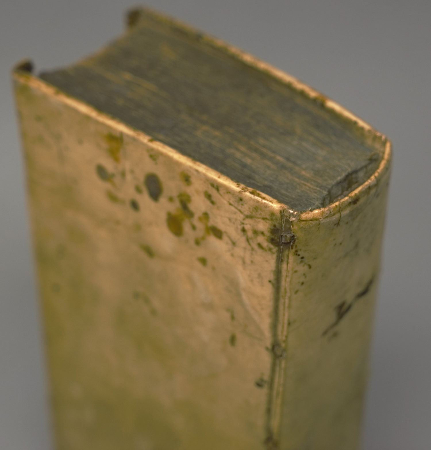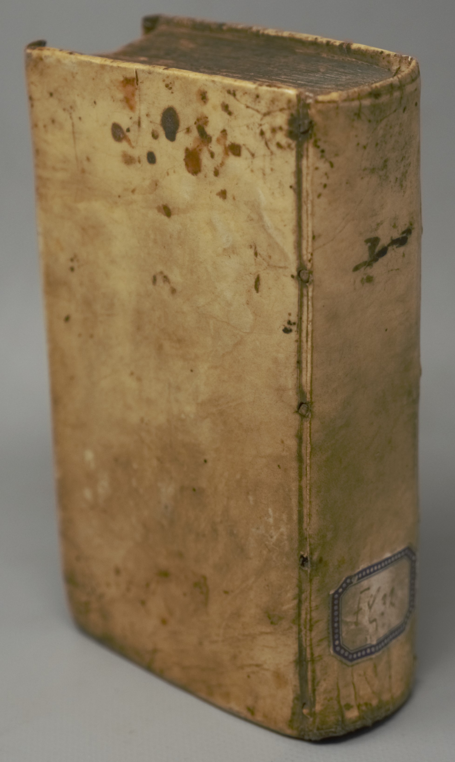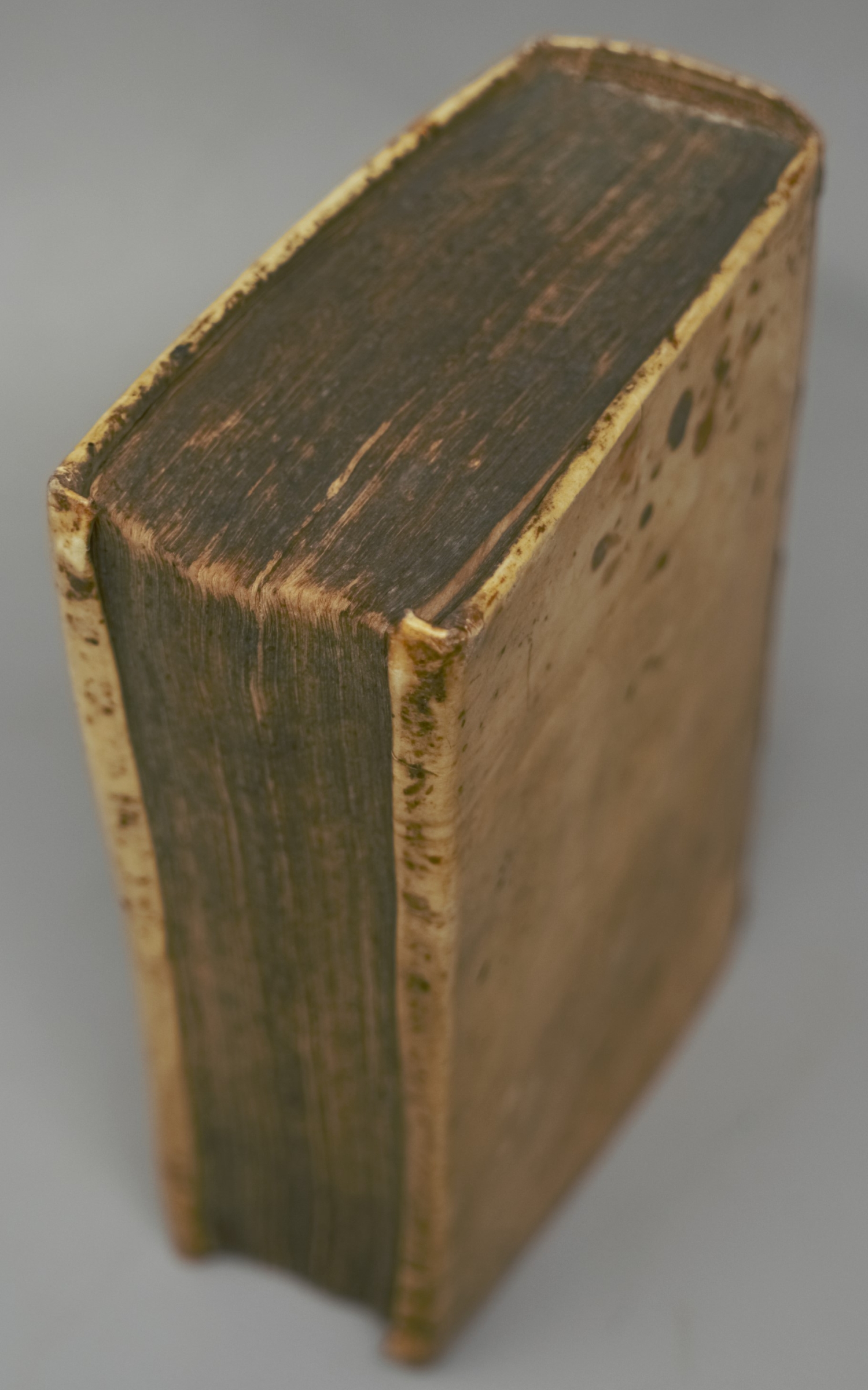 Hellwig, Christoph von (Pseud.:) Caspar Schröter. Allzeitfertiger Hauß-Verwalter, Worinnen ein Garten- Koch- Condir- und Distillir- Wie auch Artzeney-Buch. Allen Hauß-Vätern, Hauß-Müttern, Verwaltern, Pachtern, Gärtnern, Köchen ... mit sonderbahren Fleiß, auch feinen Figuren, Vorrede und Registern ausgefertiget. 6 Bl., 360 S., 1 Bl., 128, 105 S., 22 Bl., 16 S. Mit Holzschnitt-Tafel und einigen Textholzschnitten. 16,5 x 10 cm. Pergament d. Z. (stärker fleckig) mit hs. RSchild und spanischen Kanten. Frankfurt und Leipzig, Hieronymus Philipp Ritschel, 1712.