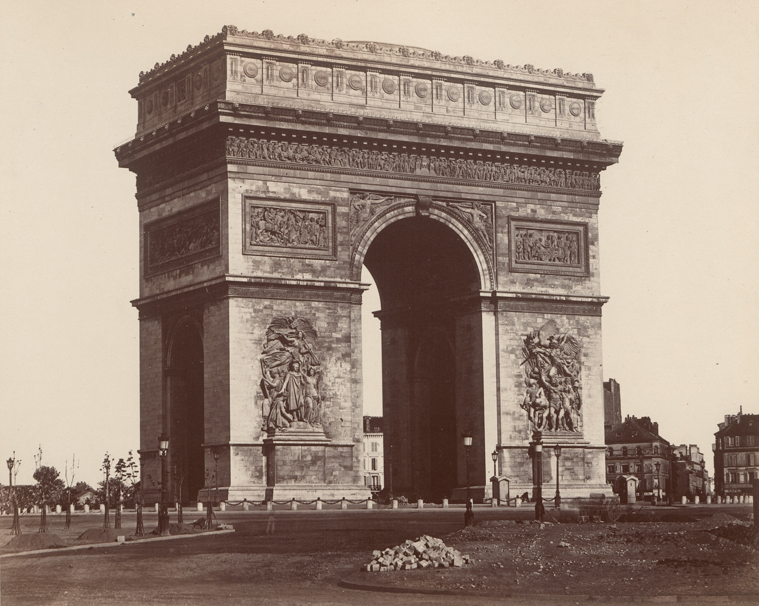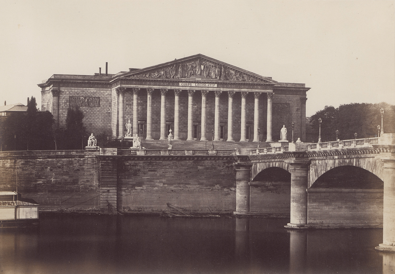 A finely produced album comprising twenty-six large-format albumen prints of Parisian architecture and monuments by Édouard Baldus. Created between 1855 and 1860, at the height of Baldus’s career - when he was widely regarded as France’s leading architectural photographer - the album offers monumental views of Haussmann-era Paris, captured with remarkable clarity and compositional precision. The photographs span medieval, Napoleonic, and Second Empire structures, including Notre-Dame, the Arc de Triomphe, Place de la Concorde, and the Louvre, as well as now-lost landmarks such as the Palais de l’Industrie, the Tuileries Palace, and the old Hôtel de Ville. Elegantly bound in a full leather folio with the gilt-stamped title and arms of the City of Paris, the volume exemplifies Baldus’s mission to preserve France’s architectural heritage while celebrating the modernization of the capital under Napoleon III. Complete and well-preserved examples of such albums are increasingly rare. – Corners of the album slightly bumped; some foxing on the cover page and small holes in the interleaf. A few pages slightly loose, with light foxing and fading, minor scuff marks, and traces of silver mirroring in the shadow areas of some prints; otherwise all prints with strong tones and in near excellent condition.