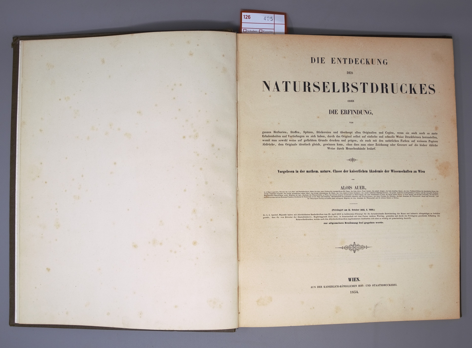 Fischer, Zweihundertjahre Naturselbstdruck, in: Gutenbergjahrbuch 1933 S. 204, 40. Wurzbach I, 85. – Separatdruck dieser 1853 im Band V der Reihe "Denkschriften der Akademie" erschienenen Publikation über die technisch vollendete Erfindung des Naturselbstdrucks. Die Tafeln zeigen neben verschiedenen Pflanzen u. a. Achate, Petrefakte und Spitzen. Der Text in den Sprachen Deutsch, Englisch, Französisch und Italienisch. – Innengelenke teils geöffnet, papierbedingt gebräunt sowie etwas stockfleckig, sonst wohlerhalten mit kräftigen Drucken.