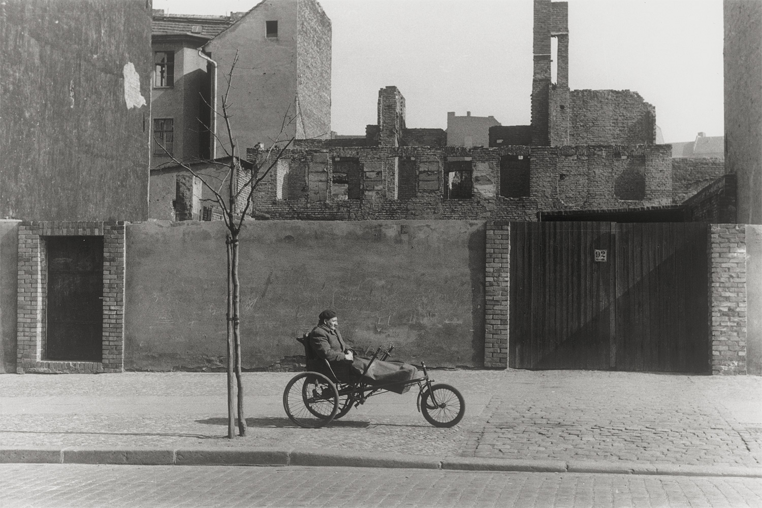 Kriegsversehrter im Rollstuhl, Berlin. 1956. Gelatin silver print, printed 1990s. 37 x 54,5 cm (50,3 x 60,5 cm). Signed, titled and dated by the photographer in pencil as well as photographer's stamp on the verso.