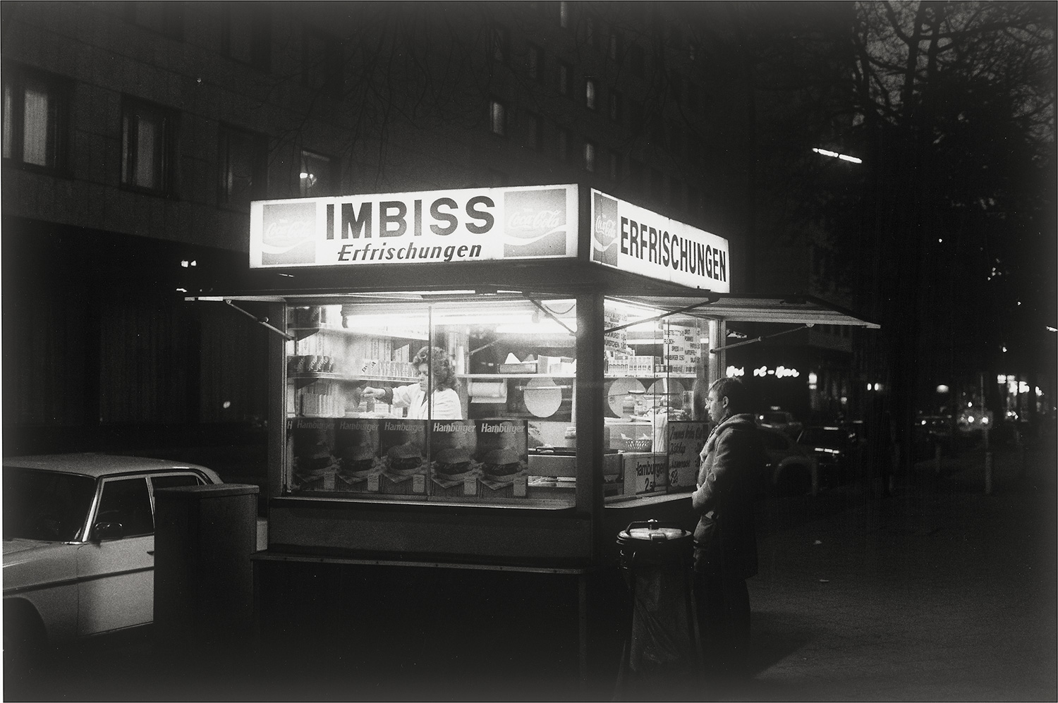 For over four decades, Nelly Rau-Häring roamed the streets of Berlin with her camera. Born in Basel, she moved to the city in 1965 to study photography at the Lette Verein. Her work traversed both West and East Berlin, capturing everyday life through expressive portraits, shopfronts, and architectural panoramas. In addition to her street photography, she gained recognition for her press and advertising work, published in magazines such as Du and Die Horen. From 1992-1995, she taught at the Hochschule der Künste (Academy of the Arts) in Berlin. – A few small retouched spots in upper left, otherwise in excellent condition.