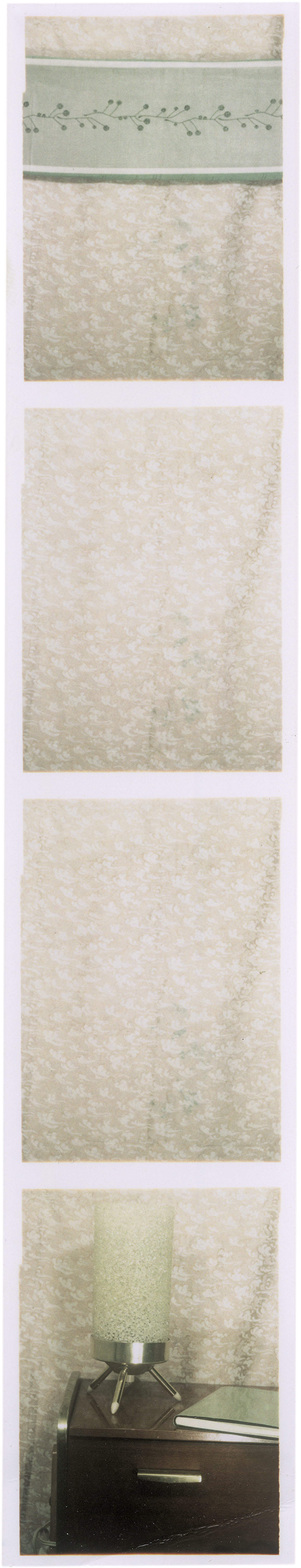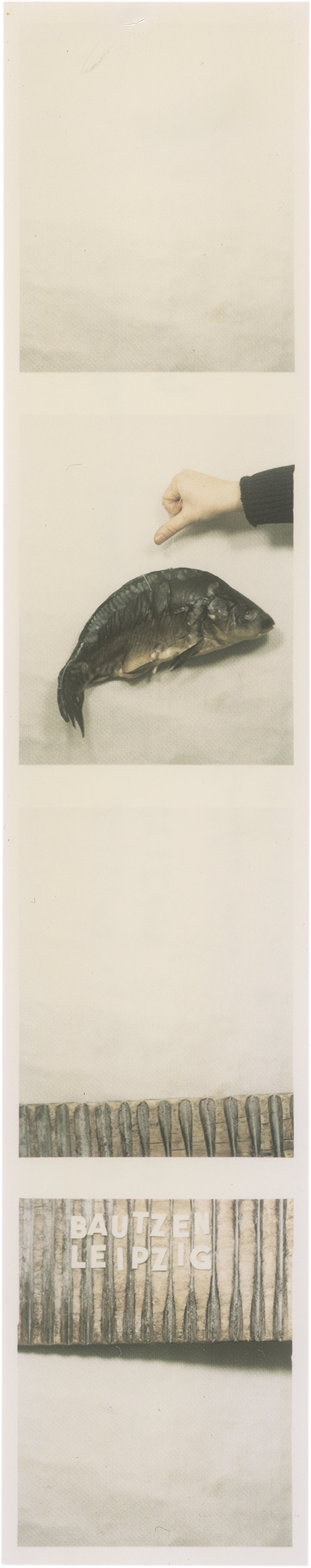 Jan Wenzel has been taking photographs in photo booths since the early 1990s. The mechanics of the machine create a photographic event that lasts exactly 28 seconds. The tableaux, often consisting of several photo strips placed together, show imaginary spaces created by the rapid change between the individual shots. They are the result of a specific choreography with which objects were held in the machine. The dynamics of the images arise from minimal differences in how they connect. Referring to these tableaux works, Wenzel stated: “Each of my photos is the result of calculation, time constraints, self-control, and chance". – One strip with crease in lower portion, otherwise in very good condition.