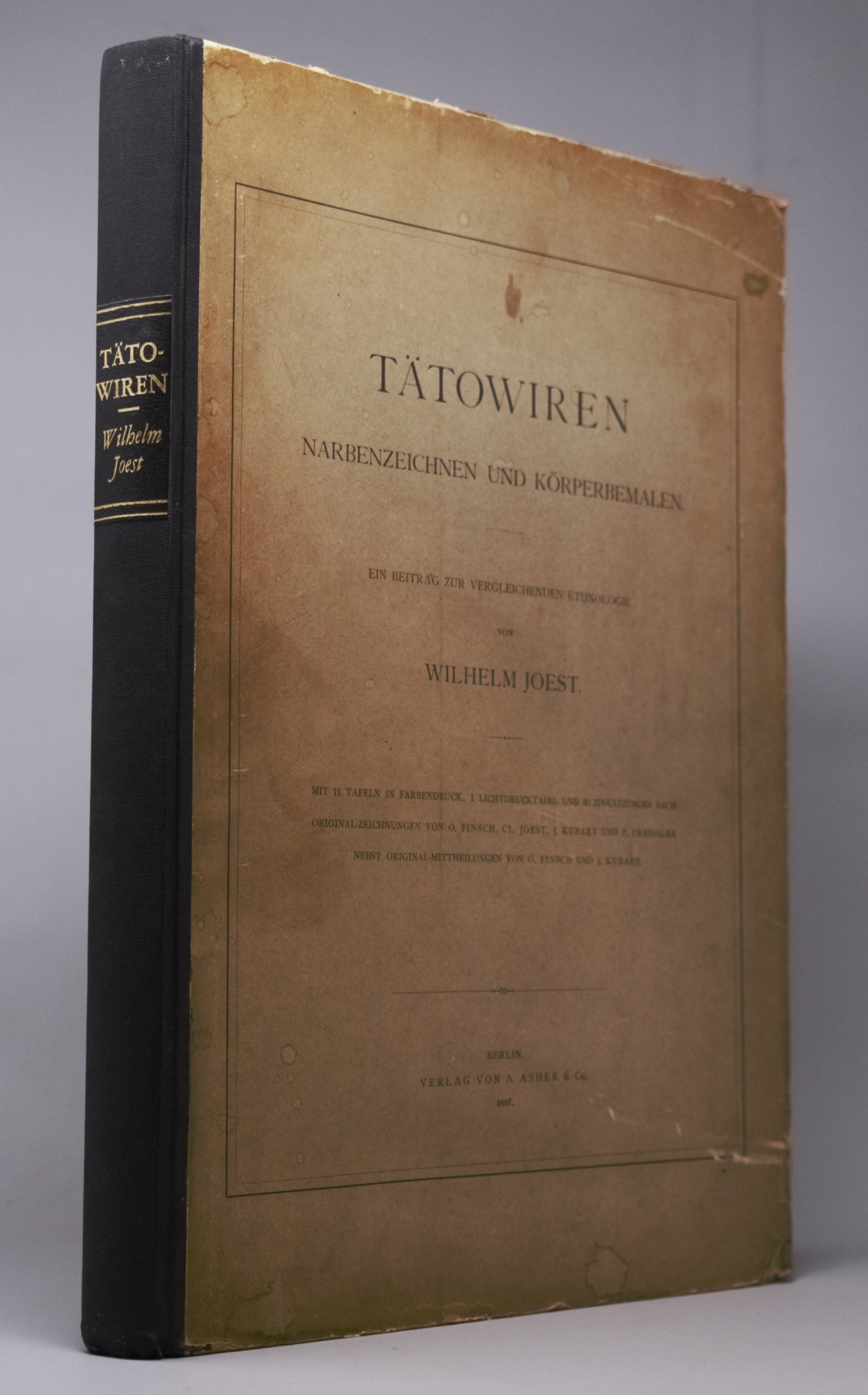 Taylor, Pacific Bibliography, 51 und 81. Hocken 380. – Erste Ausgabe des grundlegenden Werkes über Tätowierungen von dem Ethnologen und Naturwissenschaftler Wilhelm Joest (1852-1897). "An extensive treatise on tatuing and flesh-colouring, showing that the practice is widely spread and belongs to all ages. Much reference to New Zealand, and Polynesia generally, its method, and examples, also of carving in wood" (Hocken). – Vorsatz mit Besitzvermerk. Im Schnitt leicht gebräunt, kaum fleckig, Innengelenk brüchig, Klammerung angerostet. Fl. Wohlerhalten und selten.