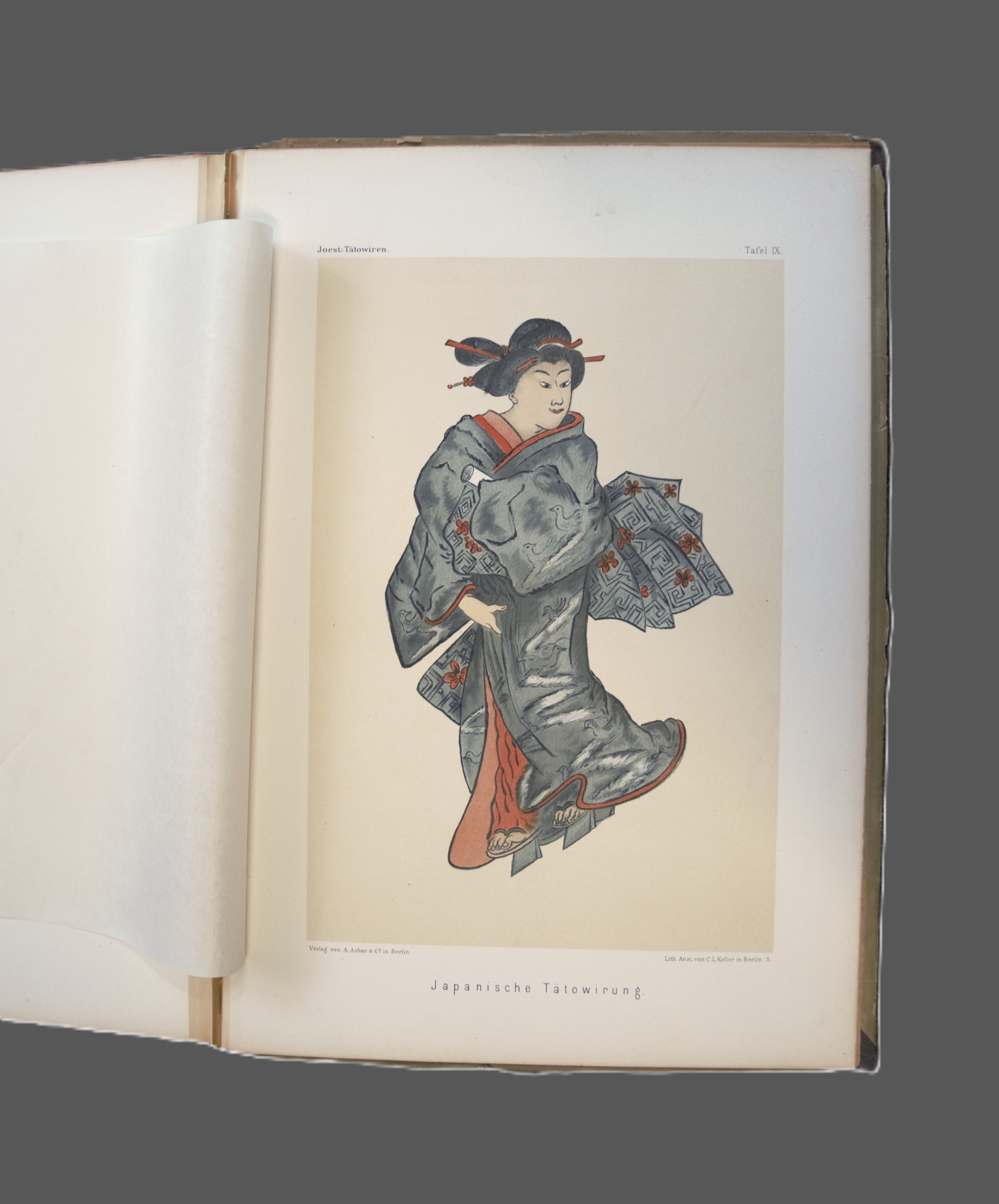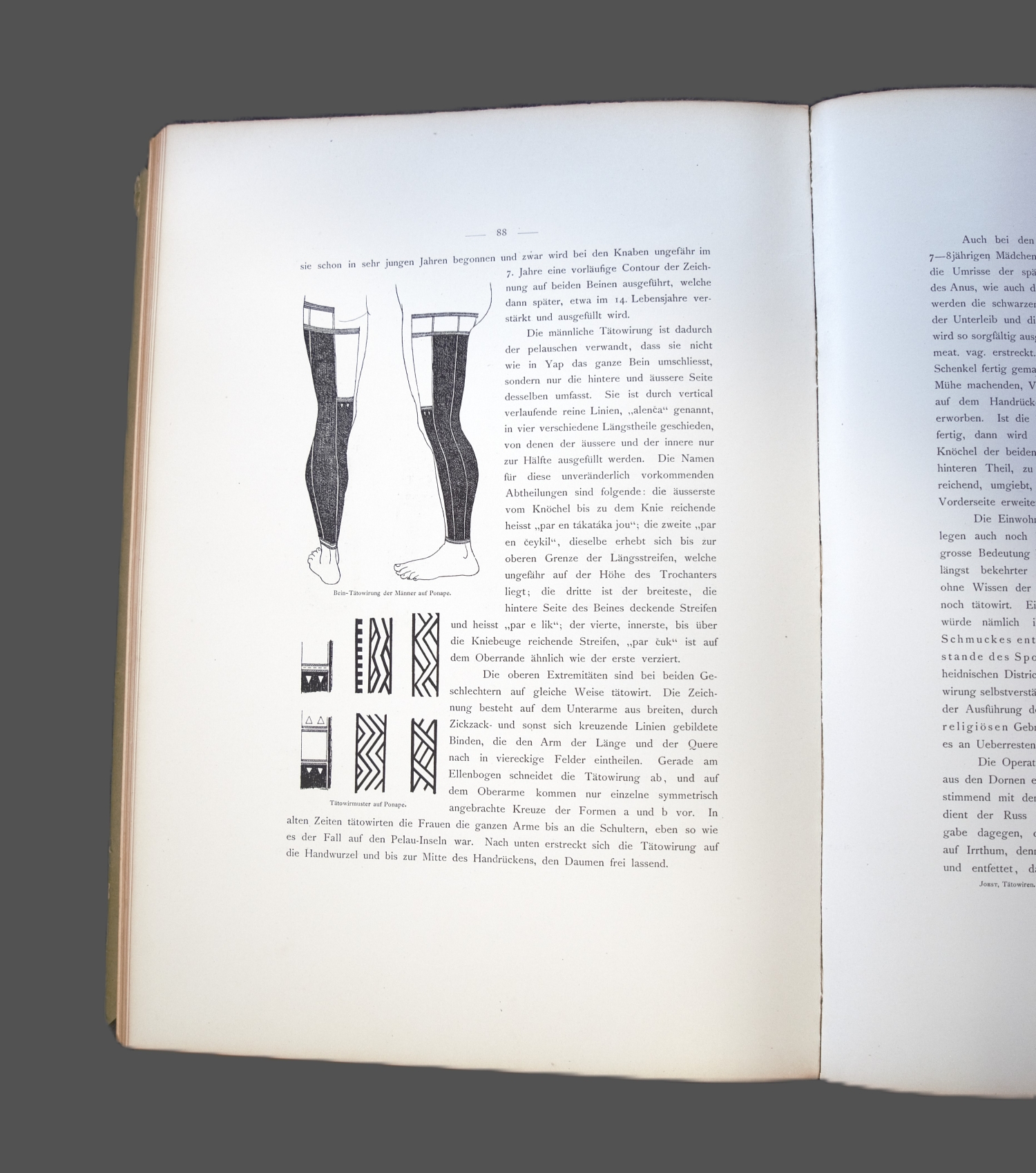 Joest, Wilhelm. Tätowiren, Narbenzeichnen und Körperbemalen. Ein Beitrag zur vergleichenden Ethnologie. Mit 11 chromolithographischen Tafeln, 1 Lichtdrucktafel und 30 Zinkätzungen nach Original-Zeichnungen. 1 Bl., VIII, 128 S. 38 x 26 cm. OHalbleinen (fleckig, beschabt und bestoßen) mit goldgeprägtem RSchild und Deckeltitel. Berlin, Asher, 1887.