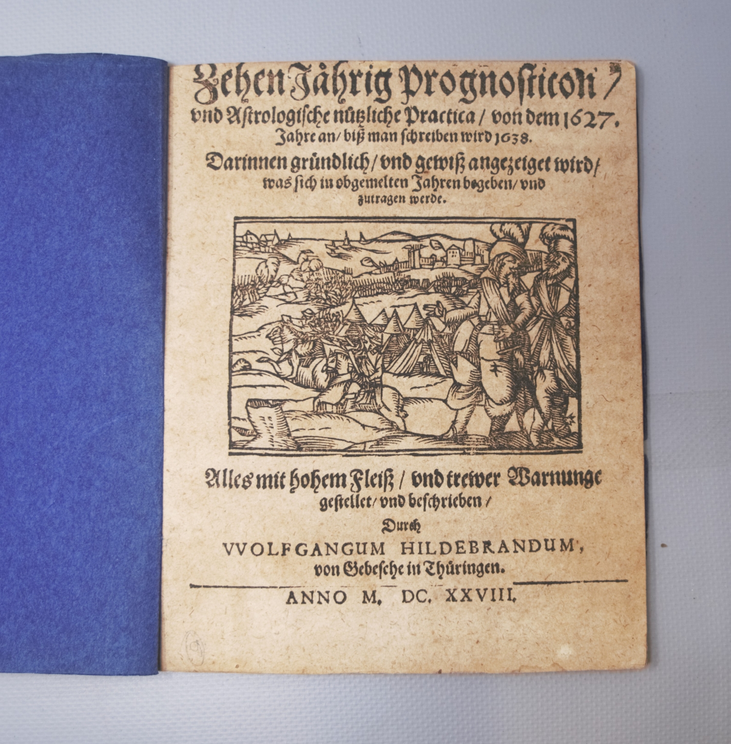 Hildebrand, Wolfgang. Zehen jährig Prognosticon und Astrologische nutzliche Practica von dem 1627 Jahre an biß man schreiben wird 1638. 14 Bl (2 letzten w. w. fehlt bzw. durch spätere Blätter ersetzt). Mit großer Holzschnitt-Vignette auf dem Titel und mit zahlreichen Text-Holzschnitten. 19 x 14,5 cm. Moderne Broschur (lichtrandig, mit Randläsuren und unteres Kapital fehlt). Gebesee, Wolfgang Hildebrand, 1628.