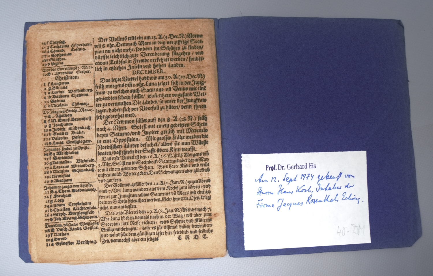 VD17 23:644965B. – Seltenes prognostisches Werk von Giovanni Antonio Magini (1555-1617), ein italienischer Astronom und Mathematiker. Wohl im Jahre 1632 zum ersten mal auf Deutsch erschienen. – Unbeschnitten und teils unaufgeschnitten. Lose im Umschlag liegende Lagen, papierbedingt gebräunt und mit Randläsuren. Mit hs. Besitzschildchen auf dem Umschlag "Prof. Dr. Gerhard Eis. Am 12. Sept. 1974 gekauft von Herrn Hans Koch, Inhaber der Firma Jacques Rosenthal Eching".