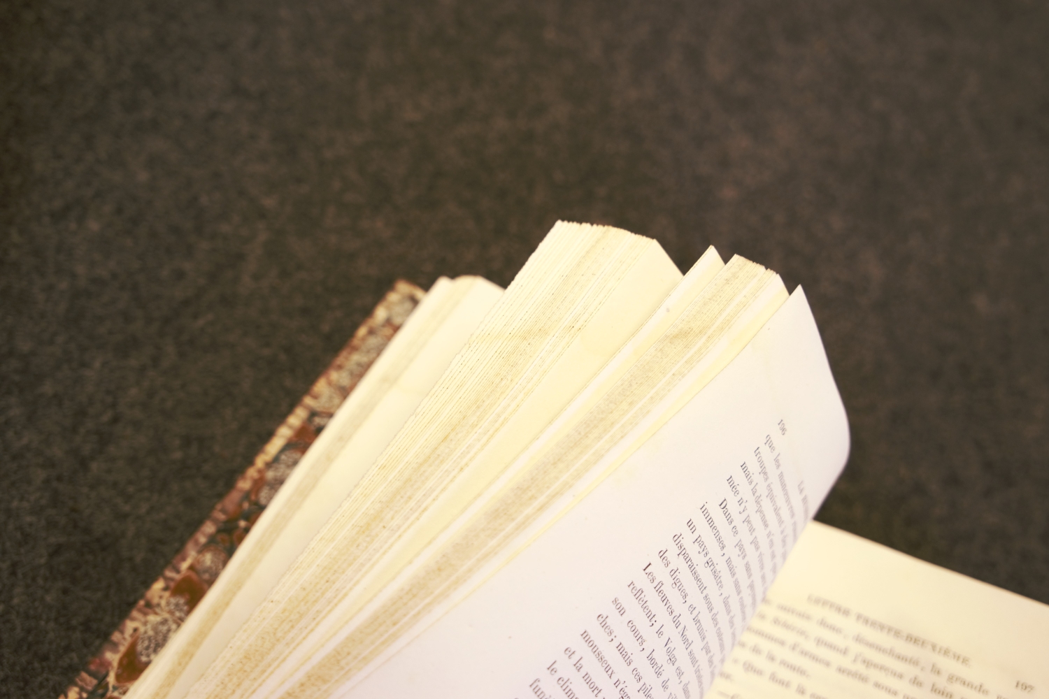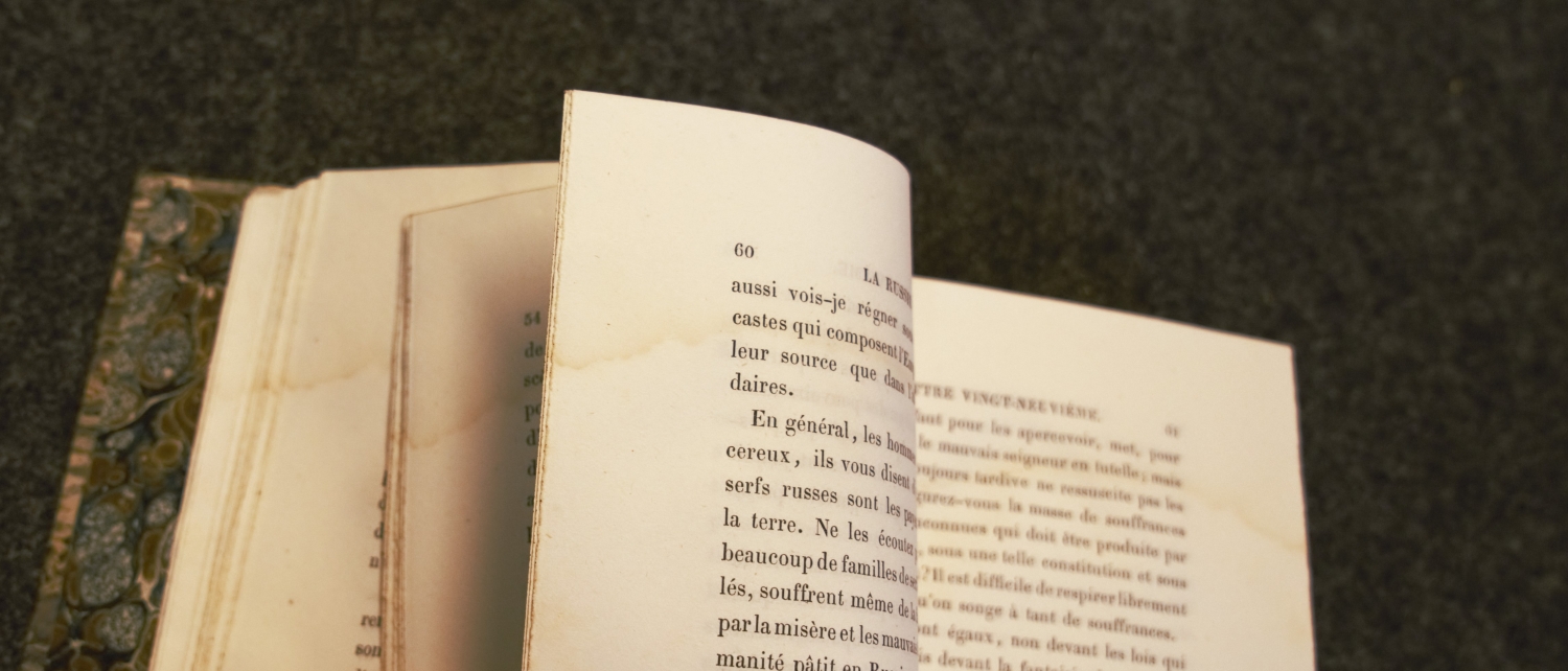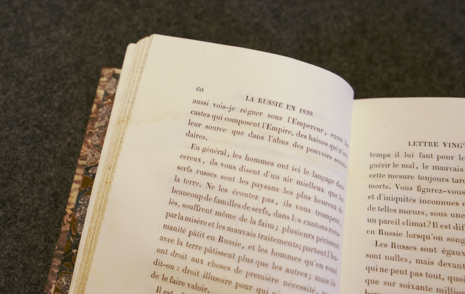 Vicaire II, 1090. – Erste Ausgabe. Umfassende politische, soziale und wirtschaftliche Darstellung Russlands in 36 Briefen, die unter dem Titel "Russische Schatten (La Russie en 1839)" dann auch in deutscher Sprache erscheinen sollten. Astolphe Louis Léonor, Marquis de Custine (1790 -1857) gehörte zu den bedeutendsten französischen Reiseschriftstellern. – Gering stockfleckig, vereinzelt schwach wasserrandig, sonst schönes Exemplar in dekorativen Einbänden. - First edition of this comprehensive political, social and economic description of Russia in 36 letters (including a fold-out genealogical table). Some minor foxing, few faint damp stains. Contemporary half calf with gilt spine, boxed in modern half calf slipcase with modern half calf cover. Altogether very fine copy in decorative romantic bindings.