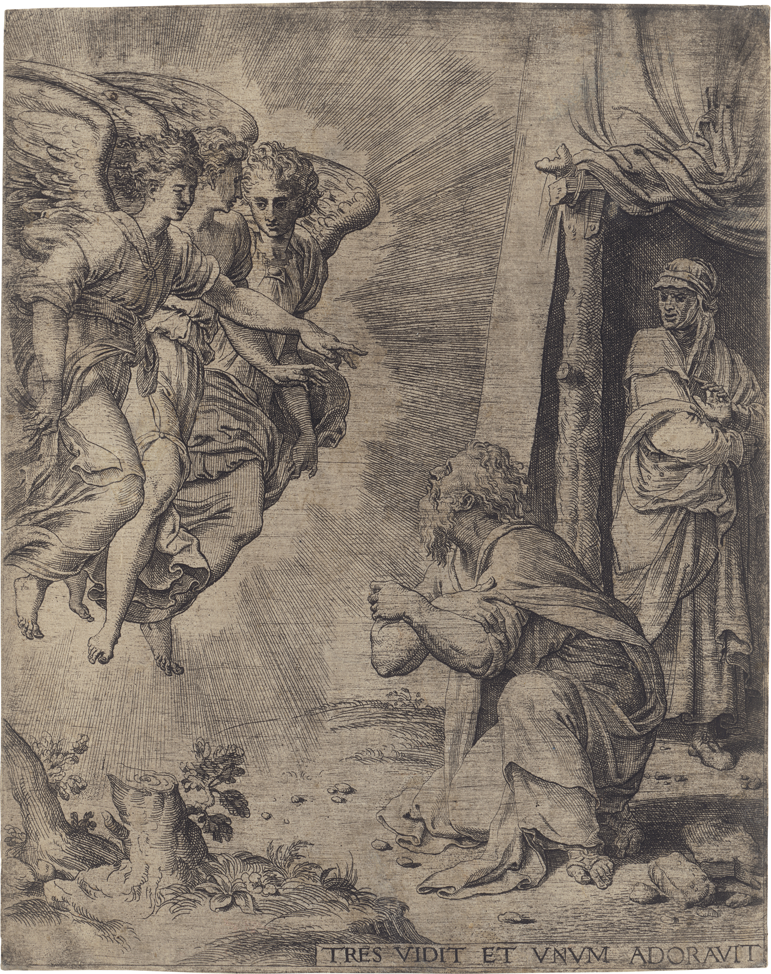 Tres vidit et unum adoravit (Abraham kniet vor den drei Engeln). Radierung. 30,5 x 24,7 cm. Um 1560-70. Nicht bei Bartsch und Passavant, Nagler, Die Monogrammisten, I, 1961, Meyer, Allgemeines Künstler-Lexikon, Bd. II, S. 36, 1.
