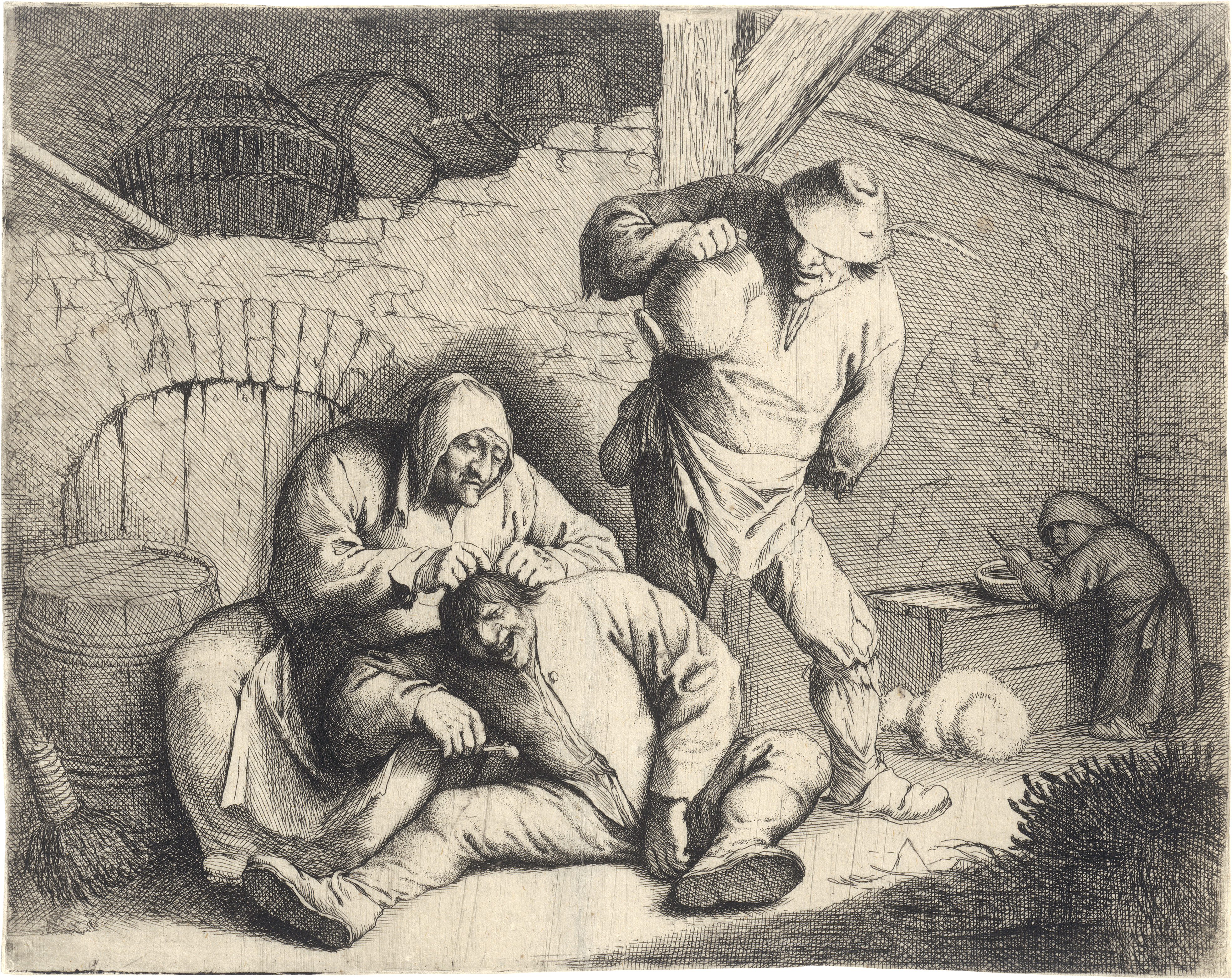 Bartsch verzeichnete die vorliegende Radierung irrtümlicherweise als eigenhändige Arbeit Adriaen van Ostades, während Louis Godefroy in seinem 1930 veröffentlichten Werkverzeichnis eine Zuschreibung an den Antwerpener Genremaler Anthoni Victorijns vorschlug. Bereits 1922 hatte Eduard Trautscholdt in seinem bei C.G. Boerner in Leipzig erschienenen Katalog der Radierungen Ostades aus der Sammlung Paul Davidsohn auf die Autorschaft Willem Basses aufmerksam gemacht, eine Zuweisung, die in der Folge auch von Hollstein übernommen wurde. Zurück geht vorliegende Darstellung auf eine Vorlage von Anthonie Victorijns, die sich im Szépművészeti Múzeum in Budapest befindet (vgl. Handzeichnungen der Albertina, Bd. XII, Nr. 1371). Prachtvoller, atmosphärischer Druck mit schönen vertikalen Wischspuren und mit den Spuren eines Rändchens um die Darstellung bzw. die Plattenkante. Vertikale Mittelfalte verso, dort unmerkliche und sorgsame Ausbesserungen, weitere unbedeutende Altersspuren, sonst sehr schön und original erhalten.