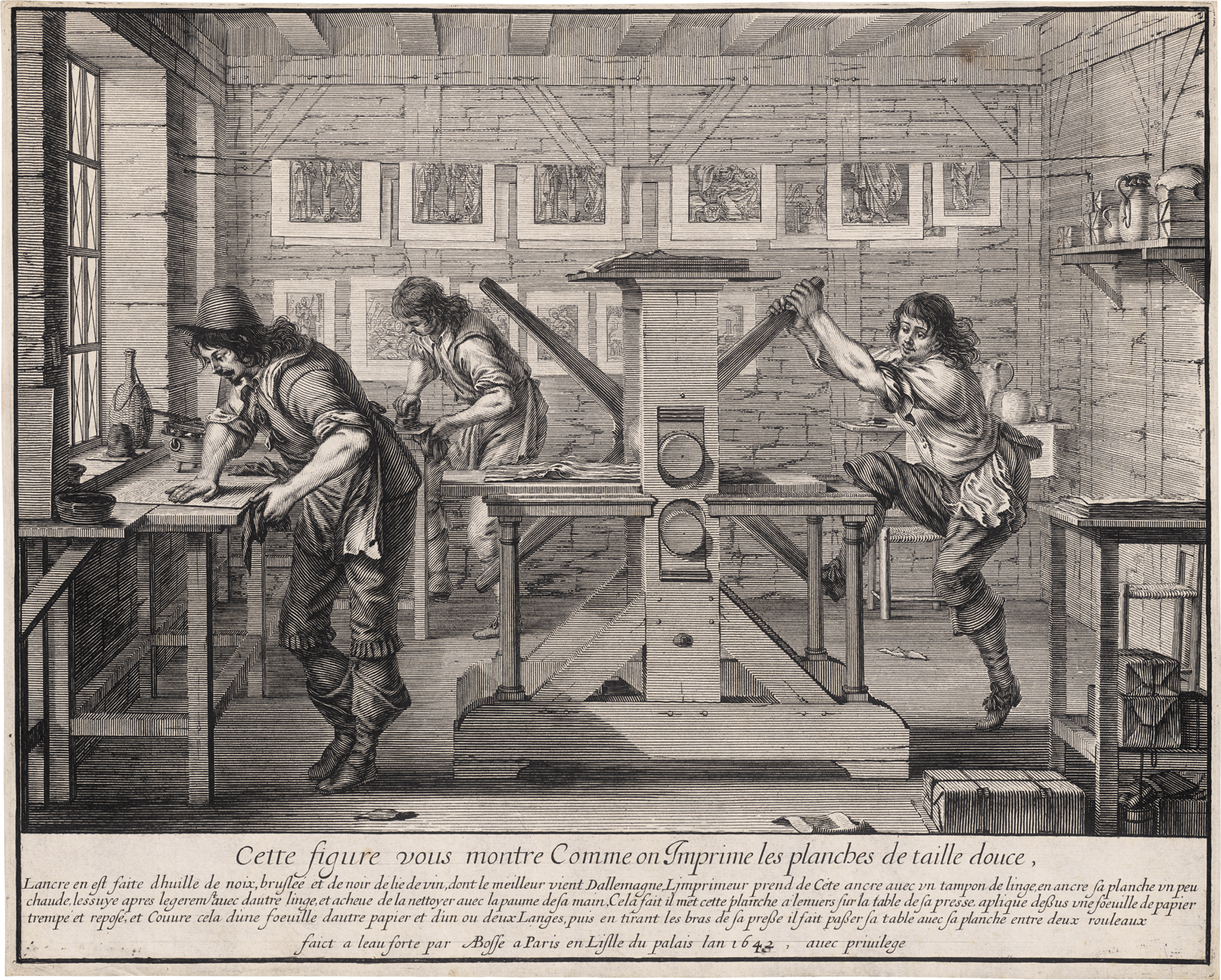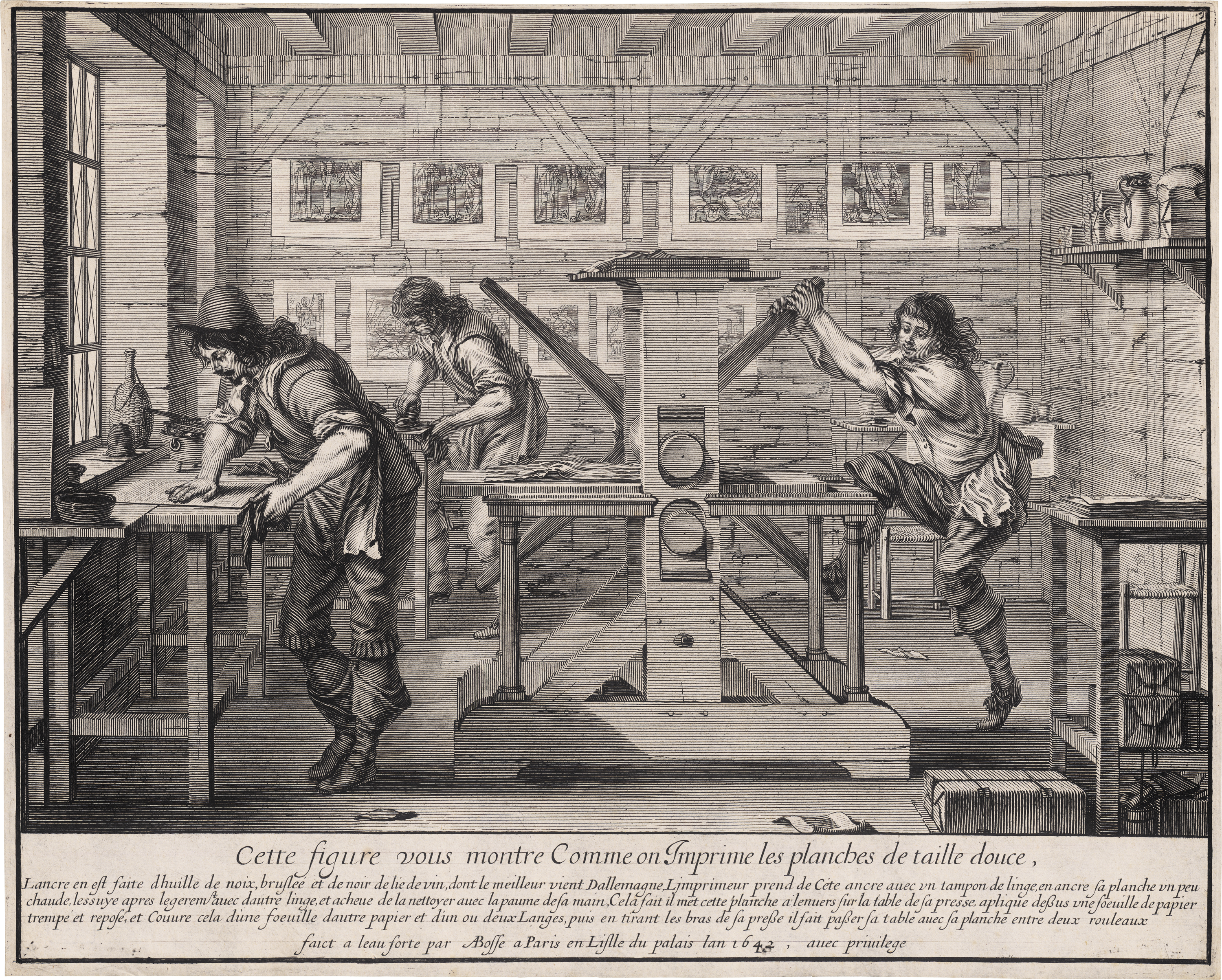 Der Kupferdrucker - Cette figure vous montre comme on imprime les planches de taille douce. Kupferstich und Radierung. 25,9 x 32,4 cm. 1642. Duplessis 1388, Blum 205, Ausst. Kat. French Prints from the Age of the Musketeers, Boston 1998, Nr. 9 mit Abb. Wz. Dreigeteiltes Wappen mit Lilie und angehängtem Malteser-Kreuz.