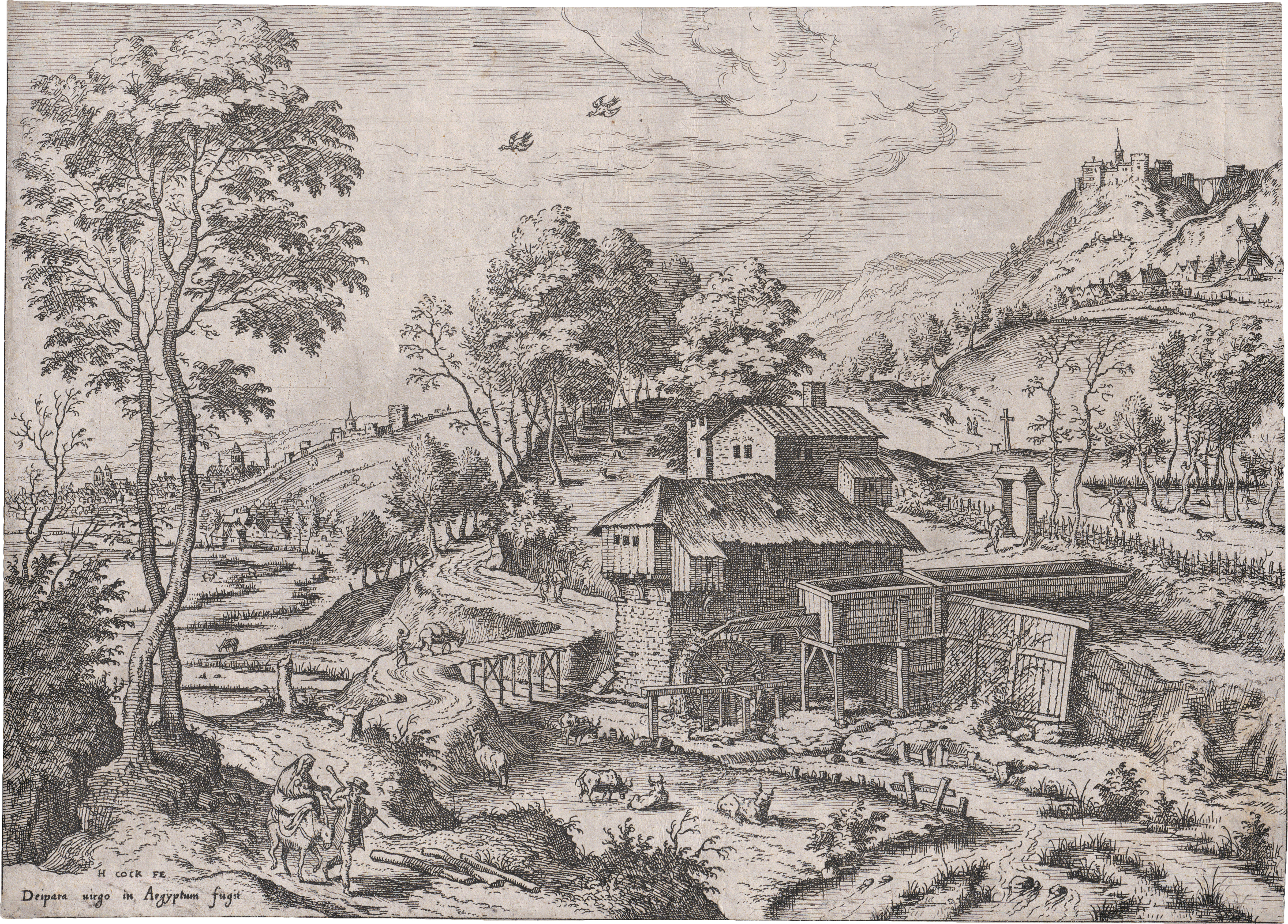Blatt 4 der Folge "Landschaften mit biblischen und mythologischen Szenen". Hieronymus Cock veröffentlichte die Serie 1558. Die Radierungen basieren auf Arbeiten, die seinem bereits 1548 verstorbenen Bruder Mathijs zugeschrieben werden. Ausgezeichneter und überwiegend klarer Druck an die meist sichtbare Einfassungslinie geschnitten, oben knapp innerhalb dieser. Verso leichte geglättete Mittelfalte mit zarten Trockenfältchen, dort oben kurzer Randeinriss, winziger geschlossener Riss am Wasserrad, rechts Vertikalfalz sowie unten rechts zwei hinterlegte vertikale Einrisse, minimal fleckig, sonst gleichwohl sehr schönes Exemplar. Aus der Sammlung Dr. Volkmar Reichmann (Lugt 6224).