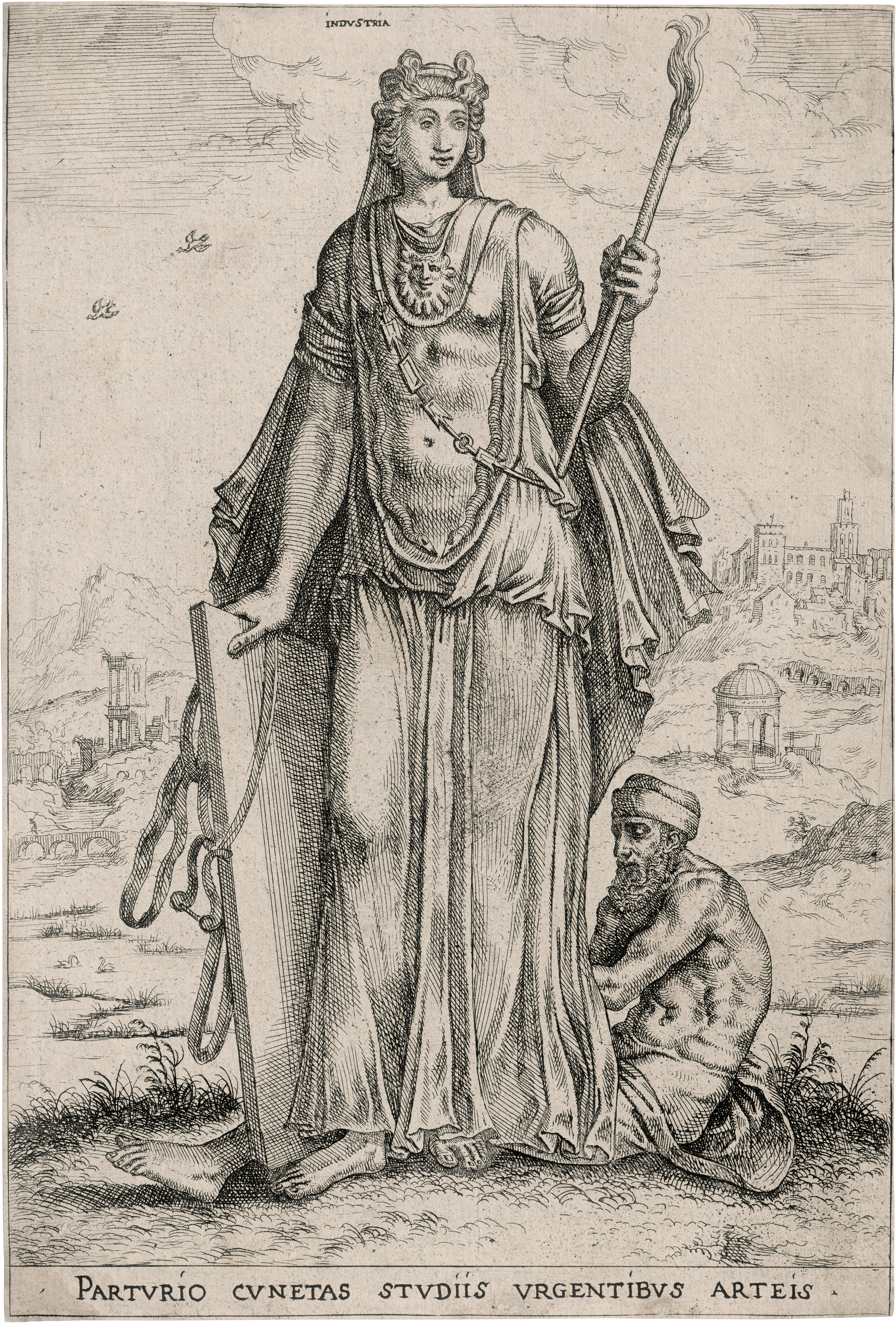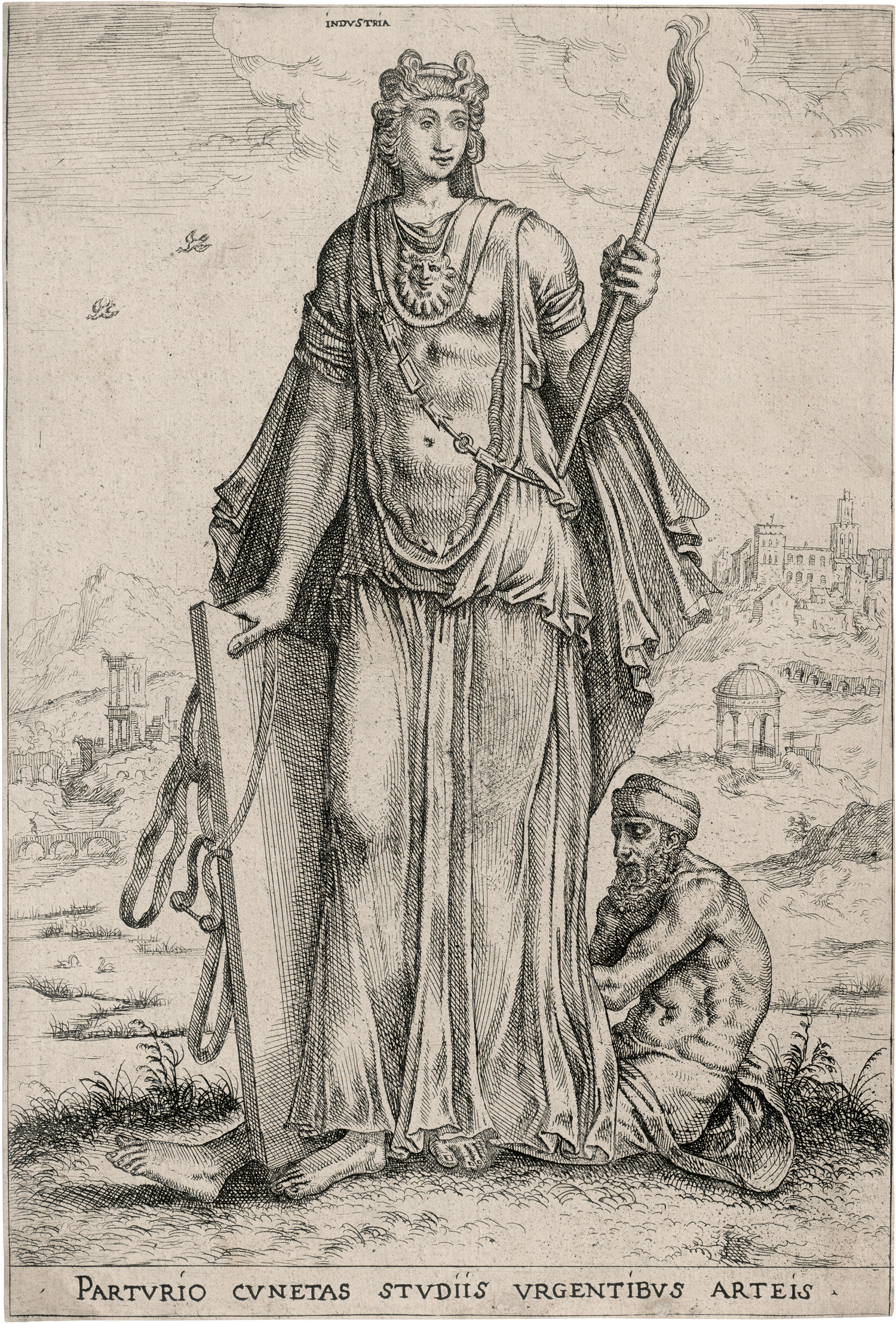 Industria (Die Personifizierung des Fleißes). Radierung nach Frans Floris. 29,5 x 20 cm. Um 1550-51. Hollstein 57, Riggs 33, Wouk (New Hollstein, Floris) 129.