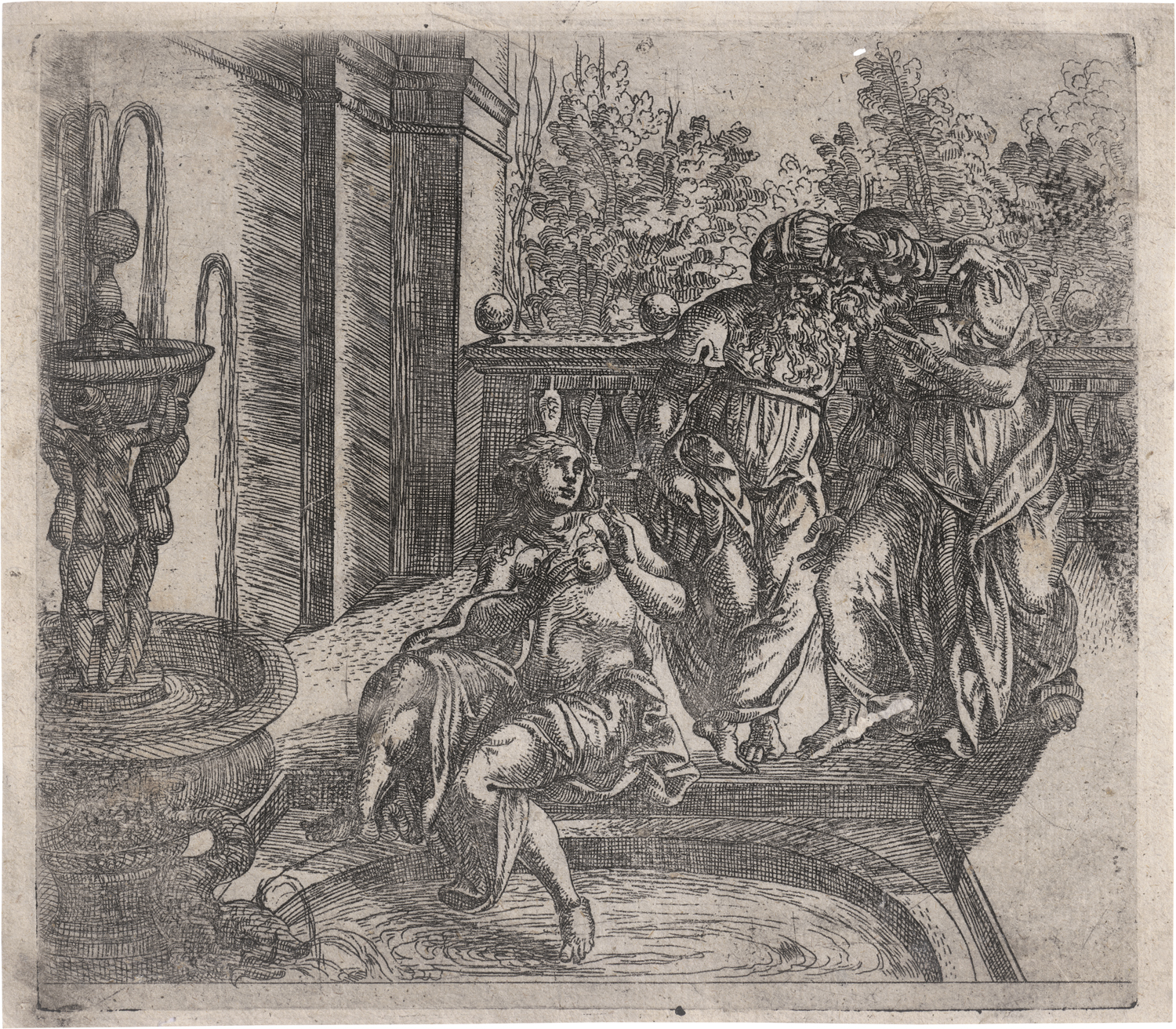 um 1600. Susanna im Bade. Radierung. 17 x 19,1 cm. Wohl unbeschrieben.