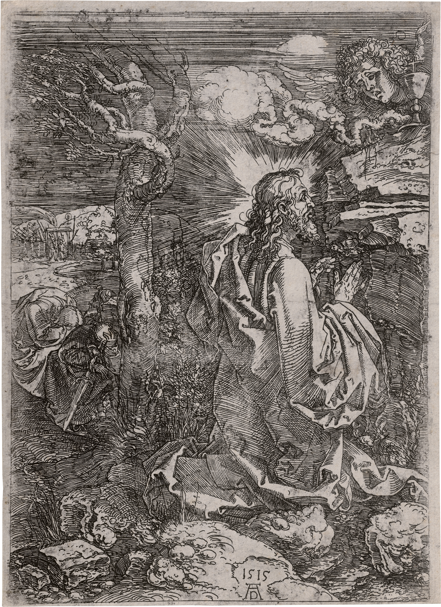 Christus am Ölberg. Eisenradierung. 22,4 x 15,9 cm. 1515. B. 19, Meder 19 II b-c (von II e).