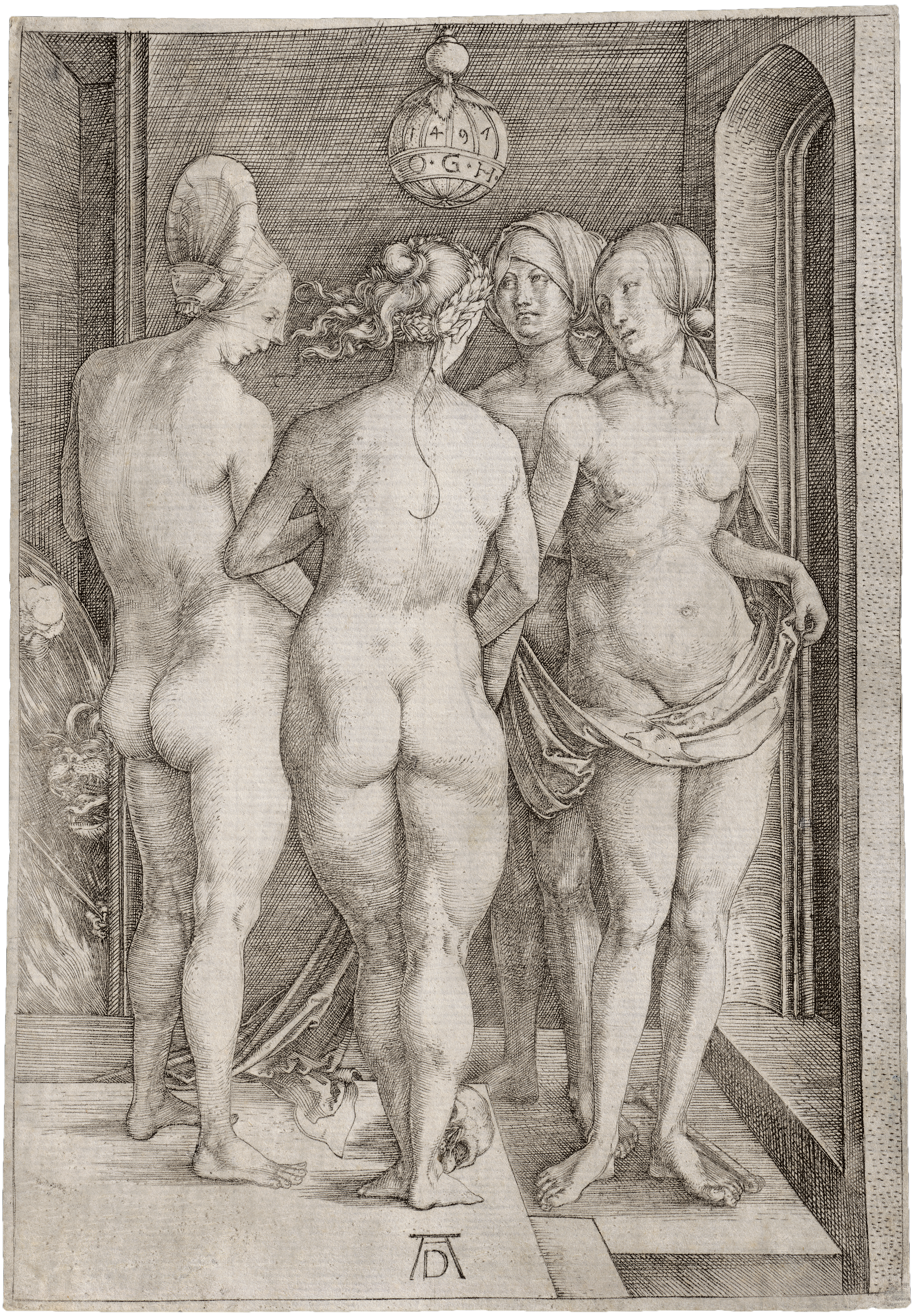 Die vier Hexen (Die vier nackten Frauen). Kupferstich. 19,3 x 13,5 cm. 1497. B. 75, Meder 69 h. Wz. Vogel über Dreiberg im Kreis.
