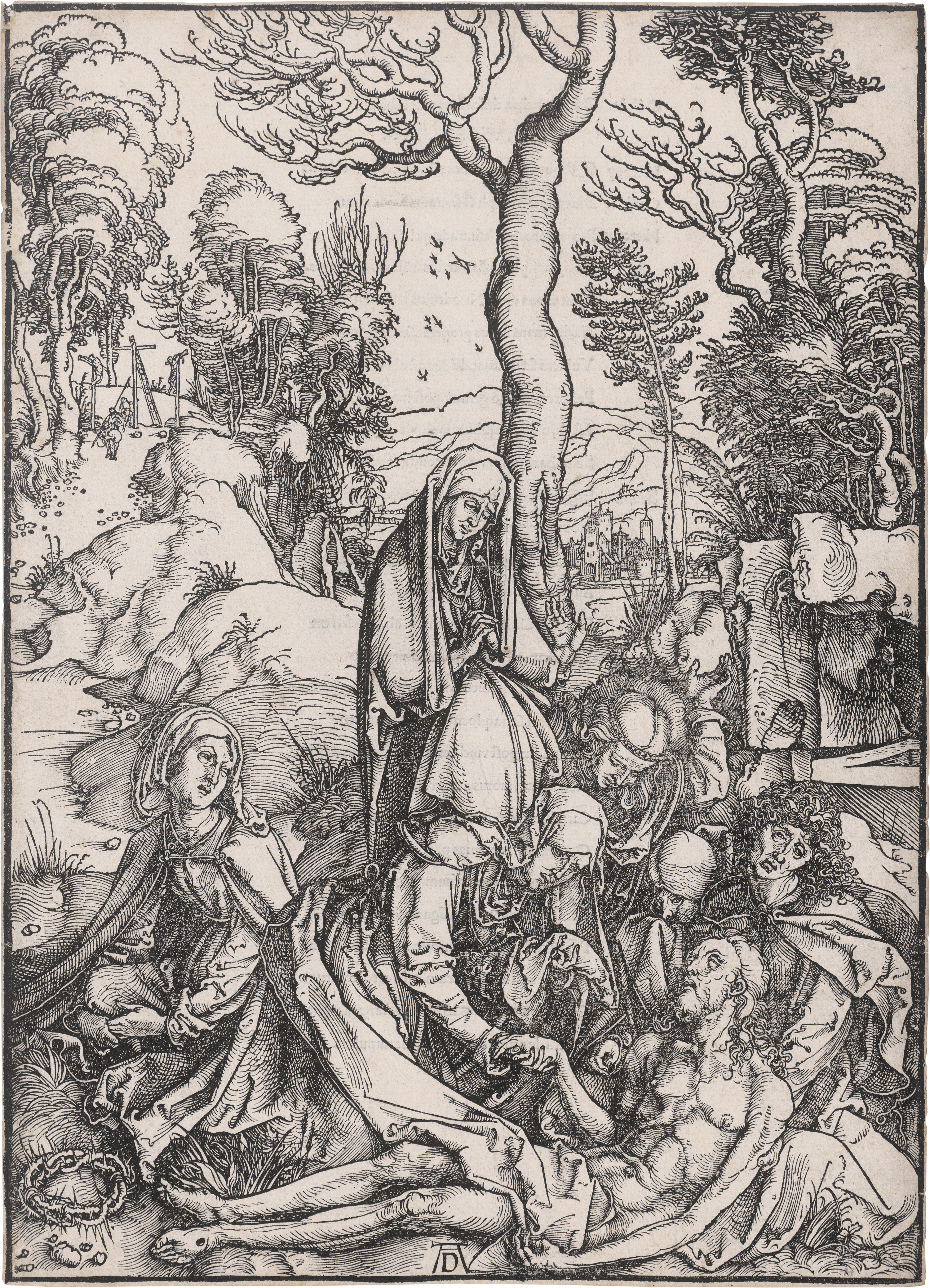 Beweinung Christi. Holzschnitt. 39,2 x 28,3 cm. Um 1497-1500. B. 13, Meder 122, lateinische Textausgabe von 1511. Wz. Gekrönter Turm (Meder 259).