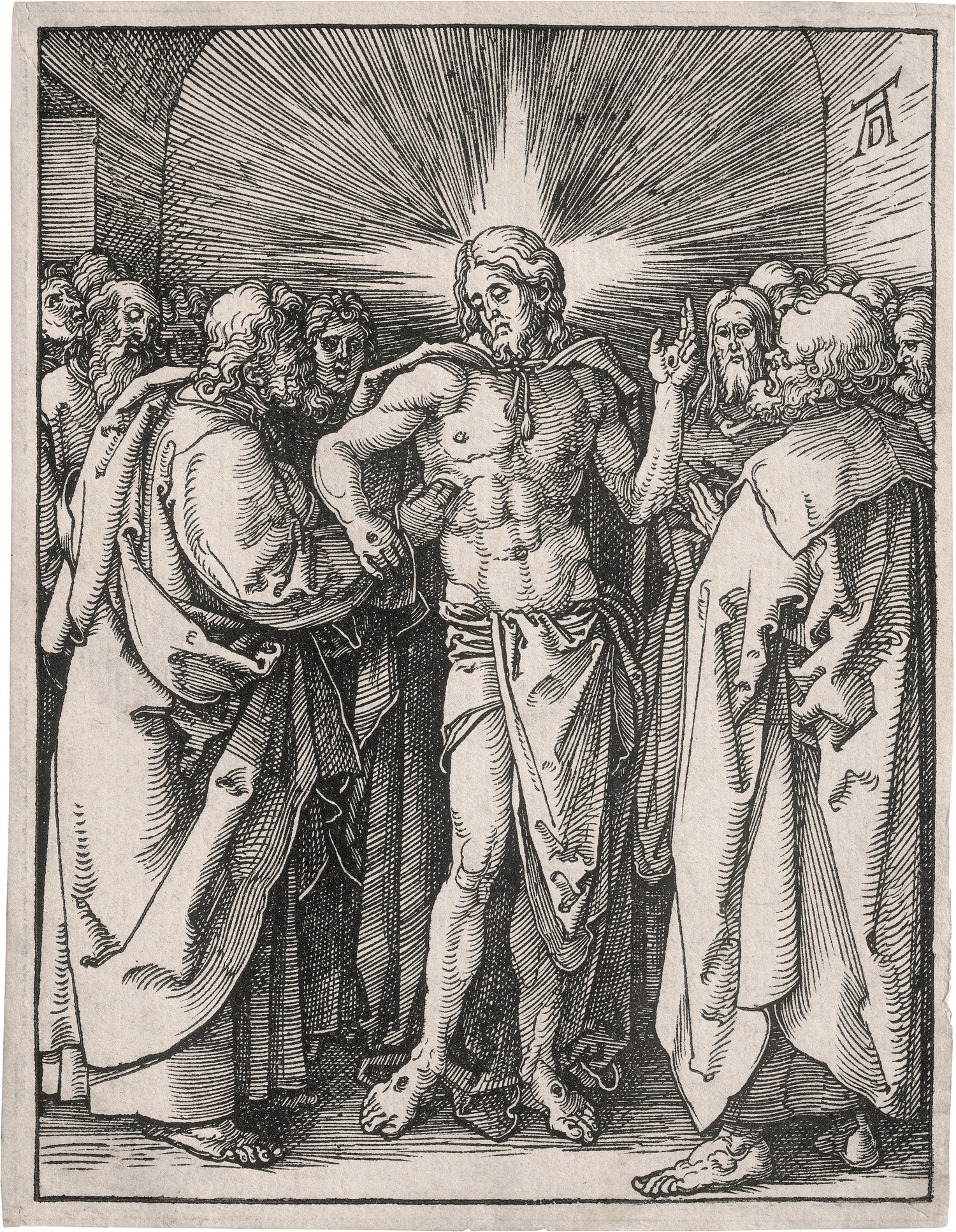 Der ungläubige Thomas. Holzschnitt. 12,7 x 9,8 cm. Um 1509-11. B. 49, Meder 158, vor dem Text. Wz. Hohe Krone (Kreuz, Fragment, Meder 20).