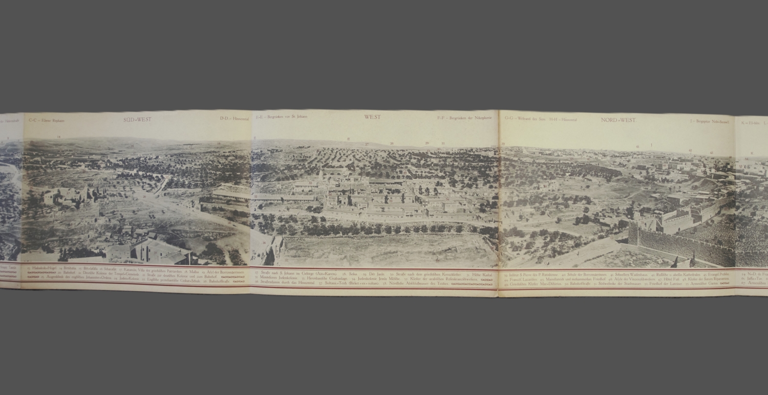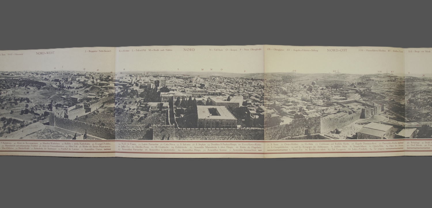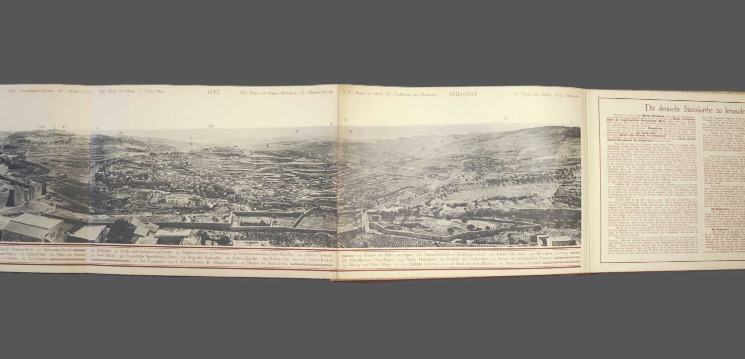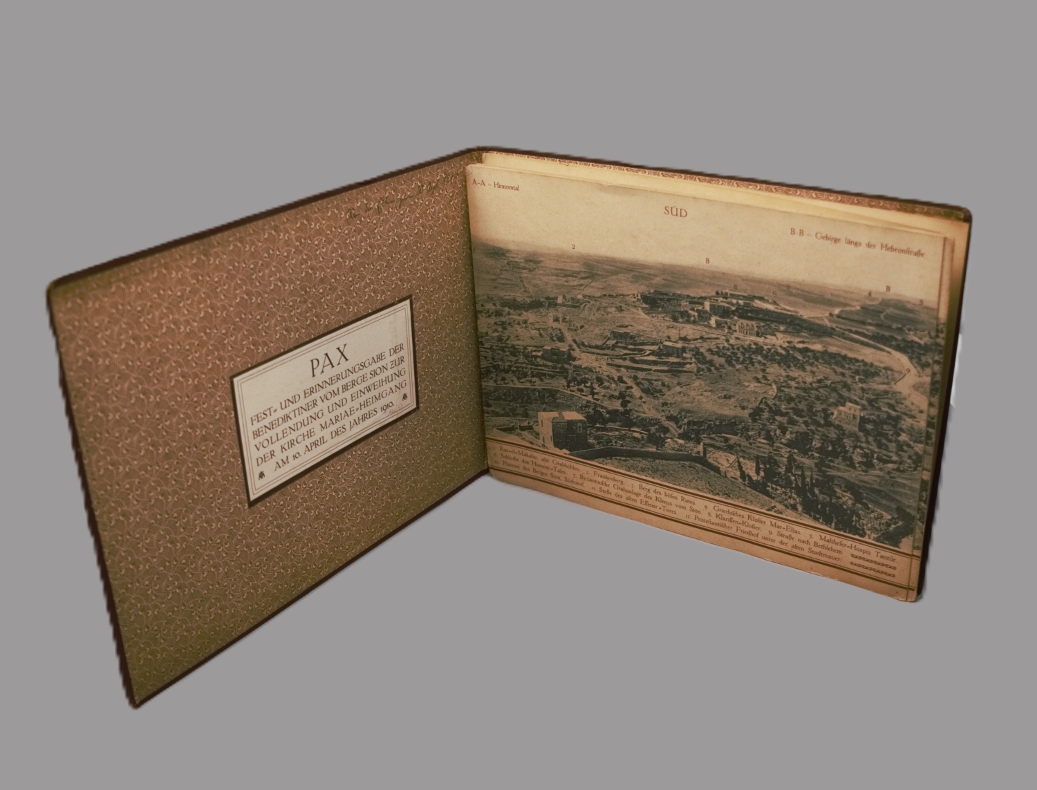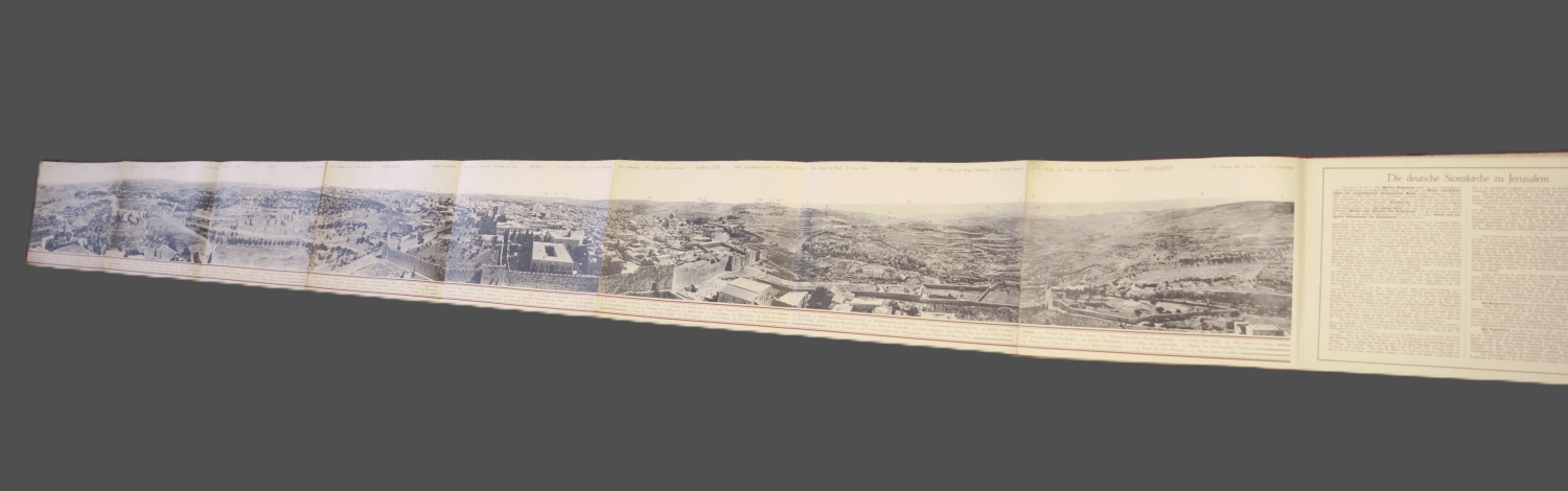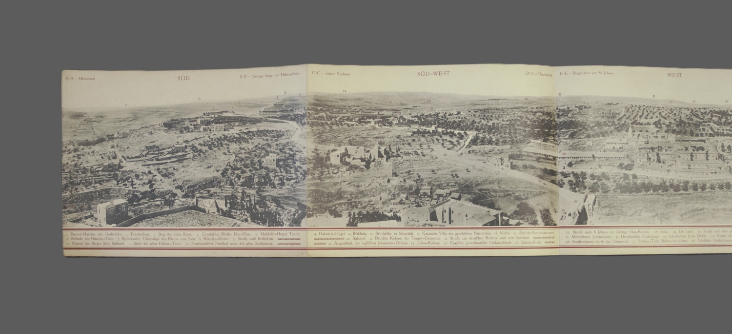 Einzige Ausgabe des prächtigen 360°-Faltpanoramas von Jerusalem im Format 21,5 x 229 cm mit untenstehender detaillierter Legende. Erschienen als "Fest- und Erinnerungsgabe der Benediktiner vom Berge Sion zur Vollendung und Einweihung der Kirche Mariae-Heimgang am 10. April des Jahres 1910" (Innendeckel). – Papierbedingt schwach gebräunt, sonst wohlerhalten. Mit Geschenkeintrag von 1914.