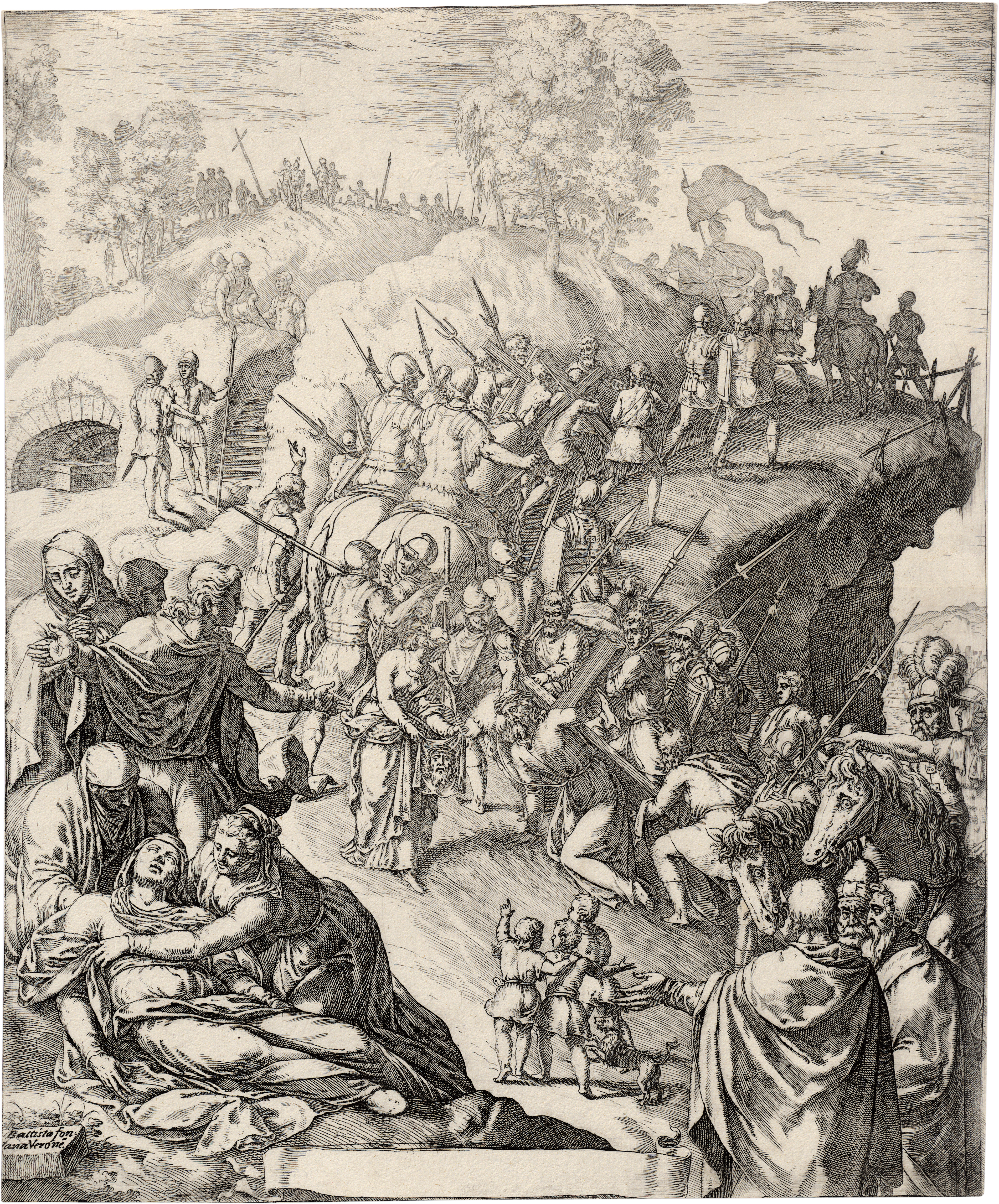 Der Maler, Zeichner und Kupferstecher Giovanni Battista Fontana wurde in seinen Anfangsjahren in Verona maßgeblich von Tizian, Veronese und Giulio Romano beeinflusst. Seit 1562 war Fontana in Wien und anschließend in Innsbruck tätig, wo er 1575 zum Hofmaler des Erzherzogs Ferdinand von Österreich ernannt wurde. Etwas mehr als siebzig Blatt haben Bartsch und Passavant Fontana zugeschrieben, die vorwiegend als Radierungen ausgeführt und mit dem Grabstichel überarbeitet wurden. Ausgezeichneter Druck mit feinem Rändchen um die Einfassungslinie, unten mit der noch stellenweise sichtbaren Einfassungslinie. Minimale Altersspuren, sonst sehr gutes Exemplar. Selten.
