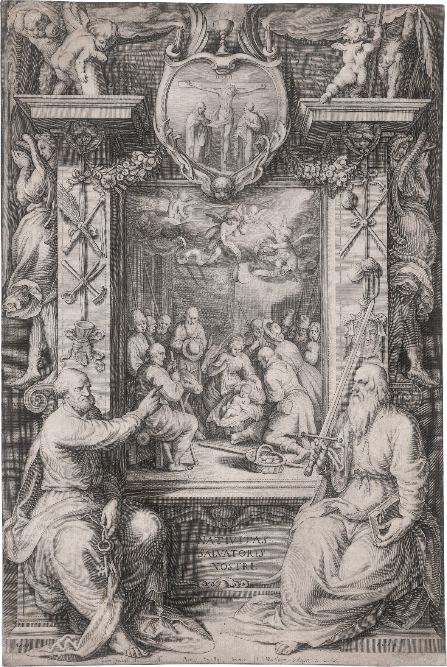Die Anbetung der Hirten mit den hll. Peter und Paulus in einer allegorischen Rahmung. Kupferstich nach Pieter Cornelisz. van Rijck. 1604. B. 195, Hollstein 32, Widerkehr (New Hollstein) 19.