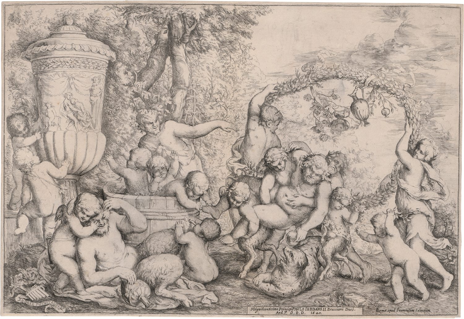 Vor Löschung der Adresse von Francesco Salucio. Ganz ausgezeichneter, gleichmäßiger Druck mit sehr feinem Rändchen um die Facette. Minimal angestaubt, geringe Altersspuren, sonst sehr schön. Beigegeben von demselben die Radierung "Bacchanal mit trunkenen Satyrn und Kindern" (B. 4). Beide aus den Sammlungen des Kupferstichkabinetts Berlin, in deren Montierung, sowie Dr. Volkmar Reichmann (Lugt 6224).